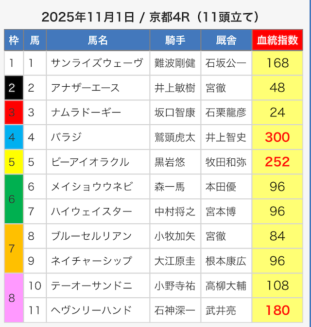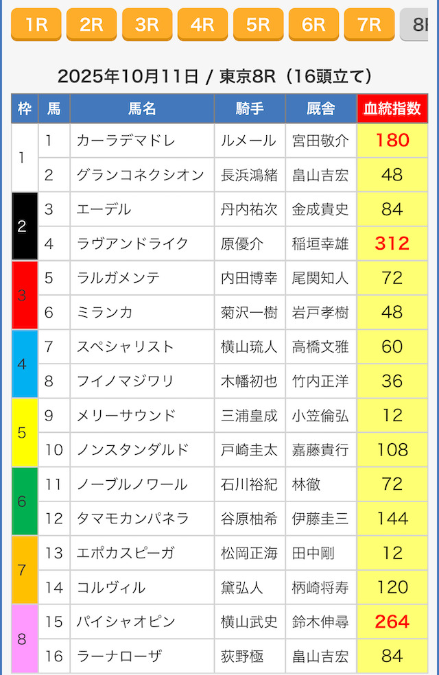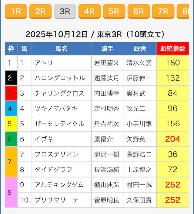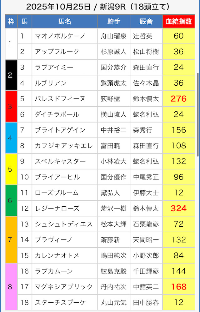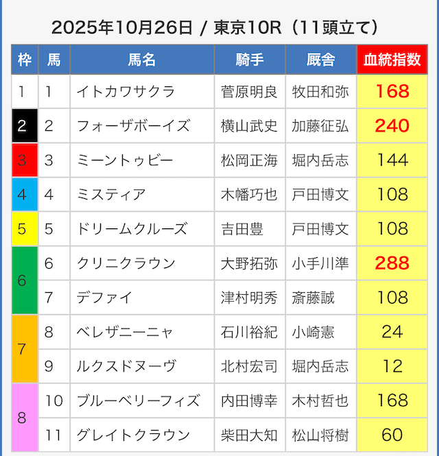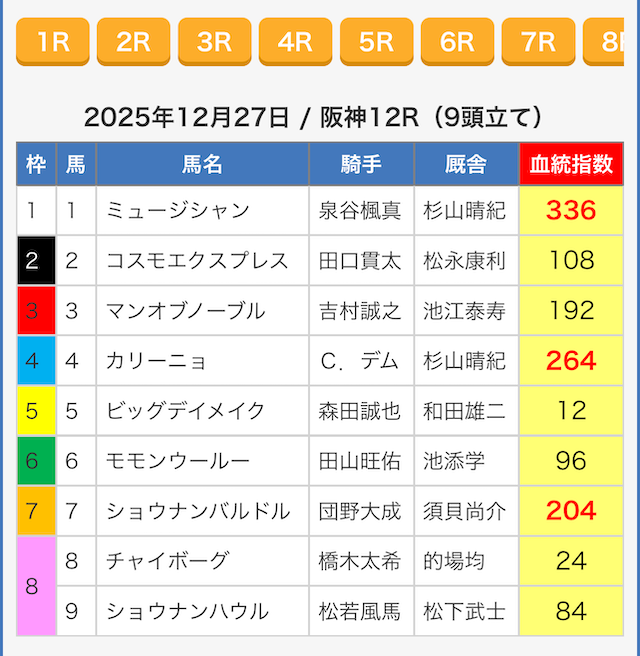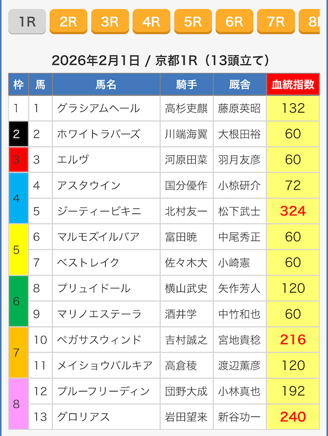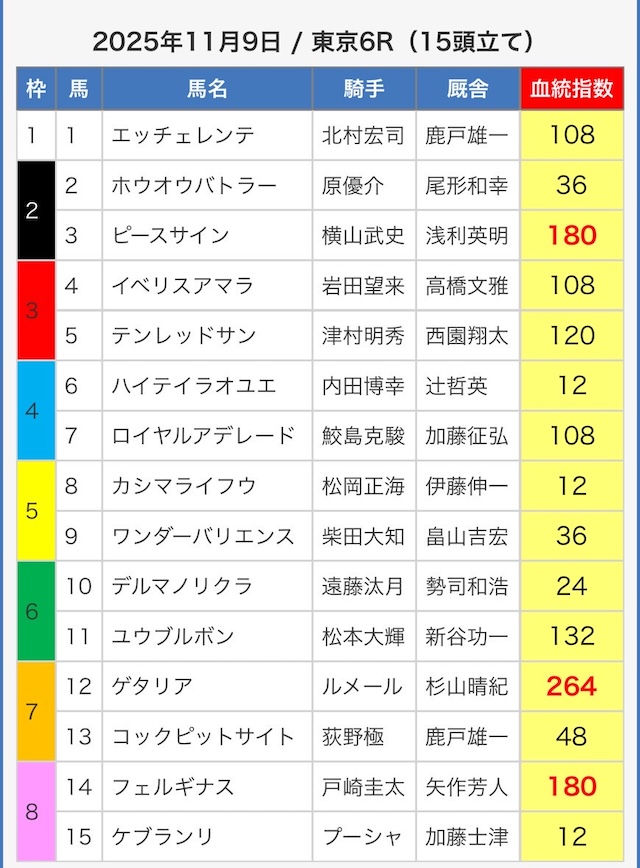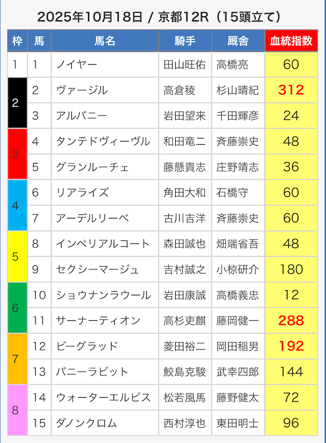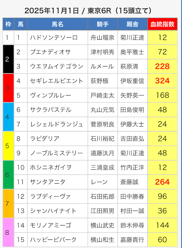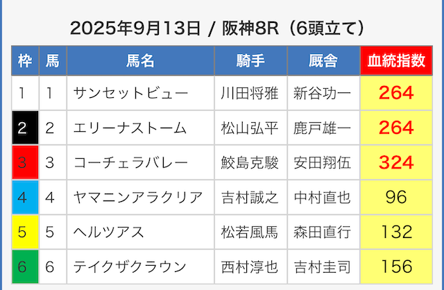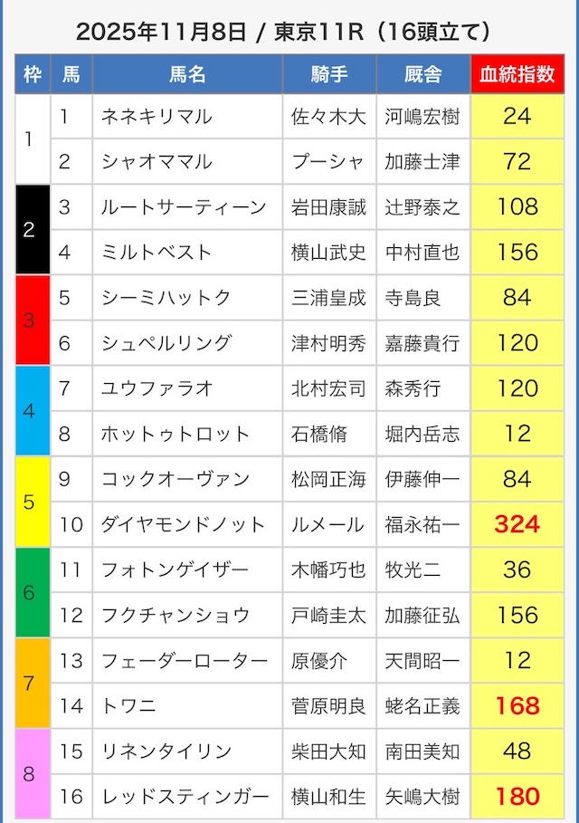 えーあいNEOが公開するのは、そのレースに出走する馬全頭分の能力指数。