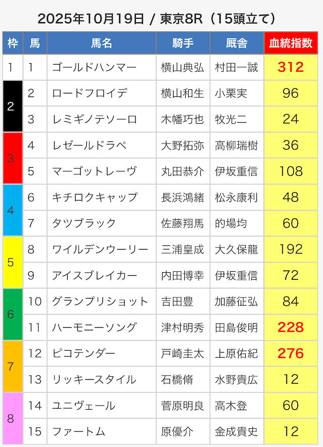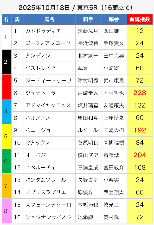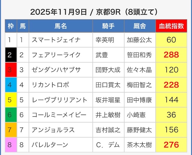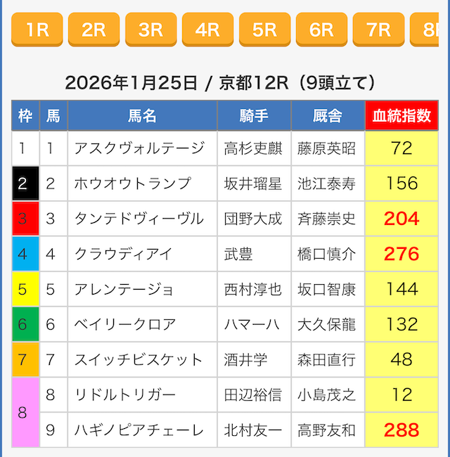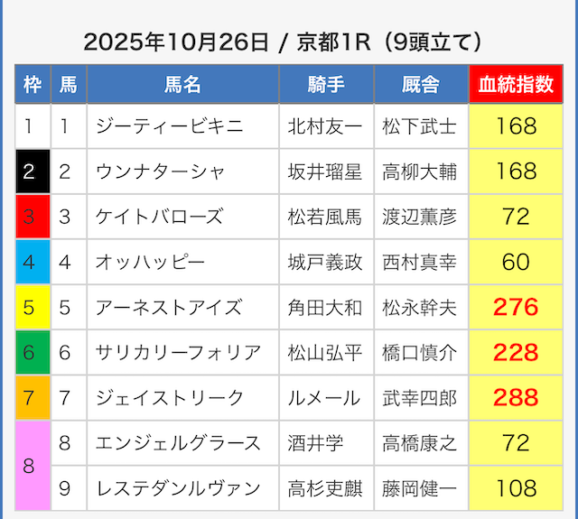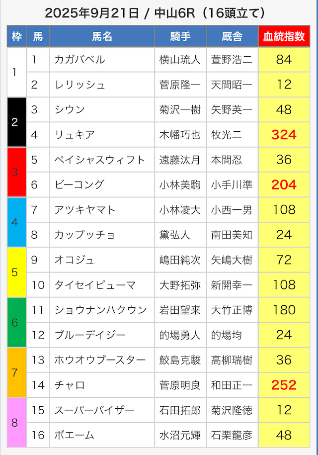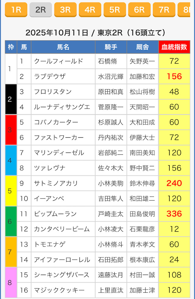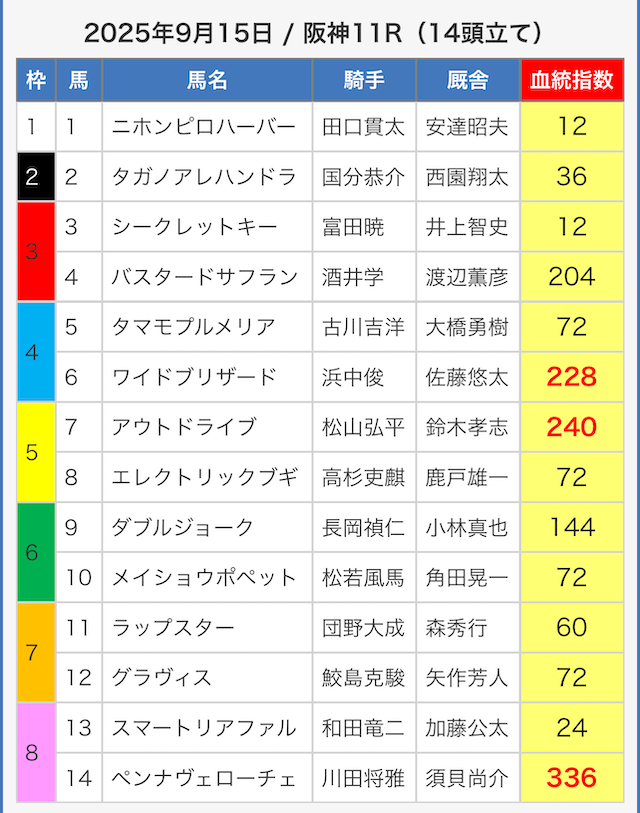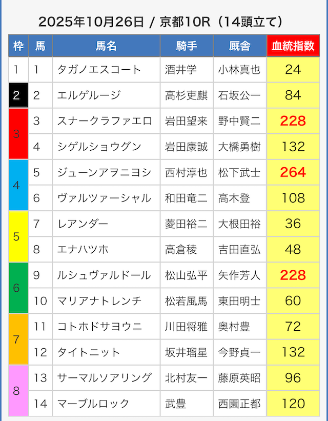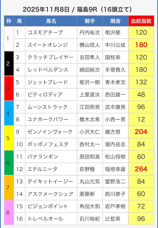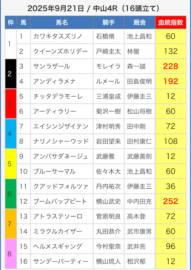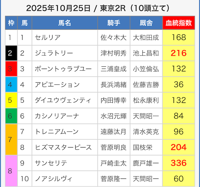 えーあいNEOが公開するのは、そのレースに出走する馬全頭分の能力指数。