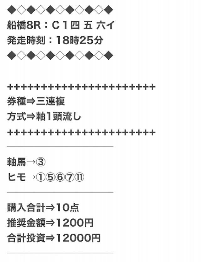 ch中山(金鞍0) | +1,782,800円 | 2,445% | 情報料金:40,000円 馬券代:36,000円 (合計76,000円) |