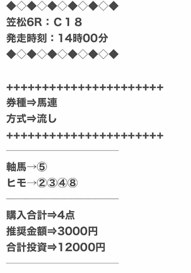 買いたくても普通は買えない、穴馬を厳選した上で当ててくれるとなると非常に頼もしい。