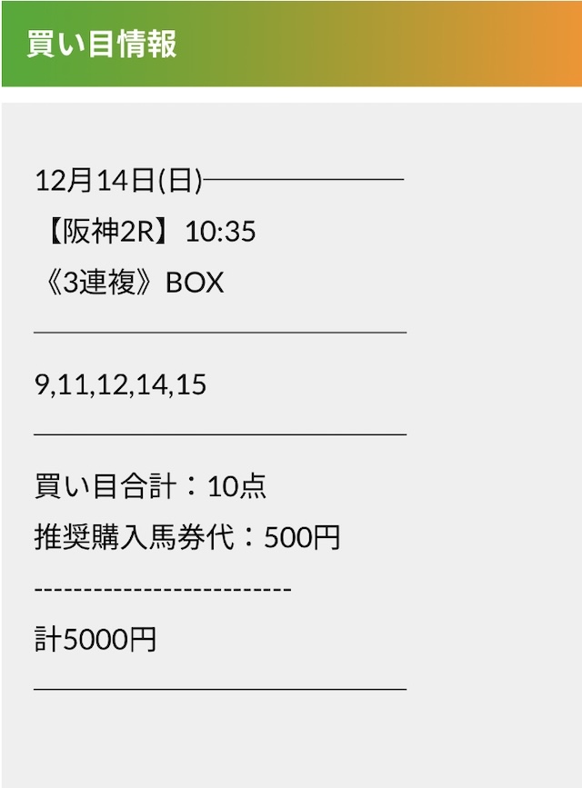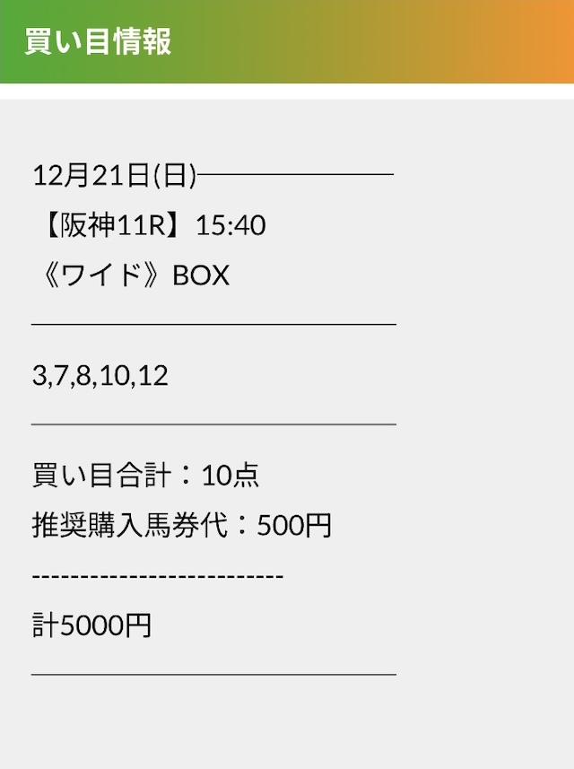 | 2023/9/24 中山7R:的中 | サジタリアス | +34,750円 | 111% | 情報料金:300,000円 馬券代:6,000円 (合計306,000円) | 3連単:12点 681.5倍 |