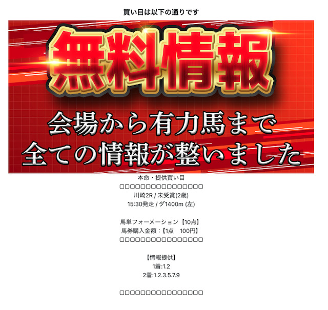 登録後いきなり有料予想を購入するのはおすすめしませんが、無料予想の確認だけならリスクはありません。