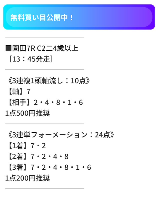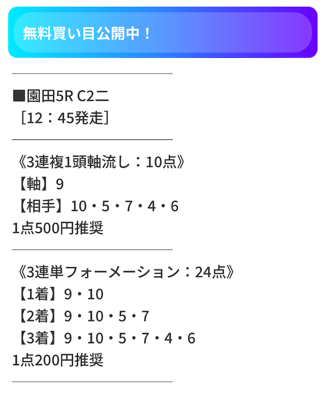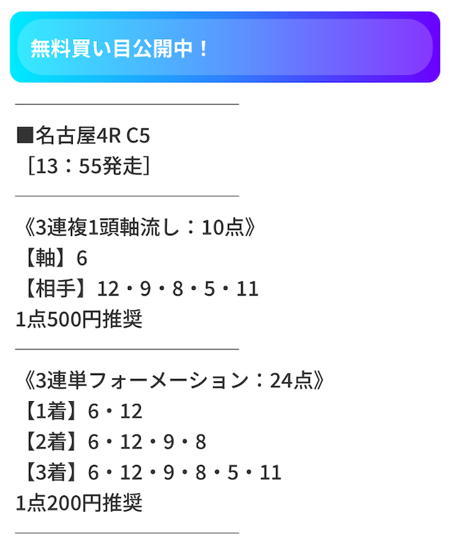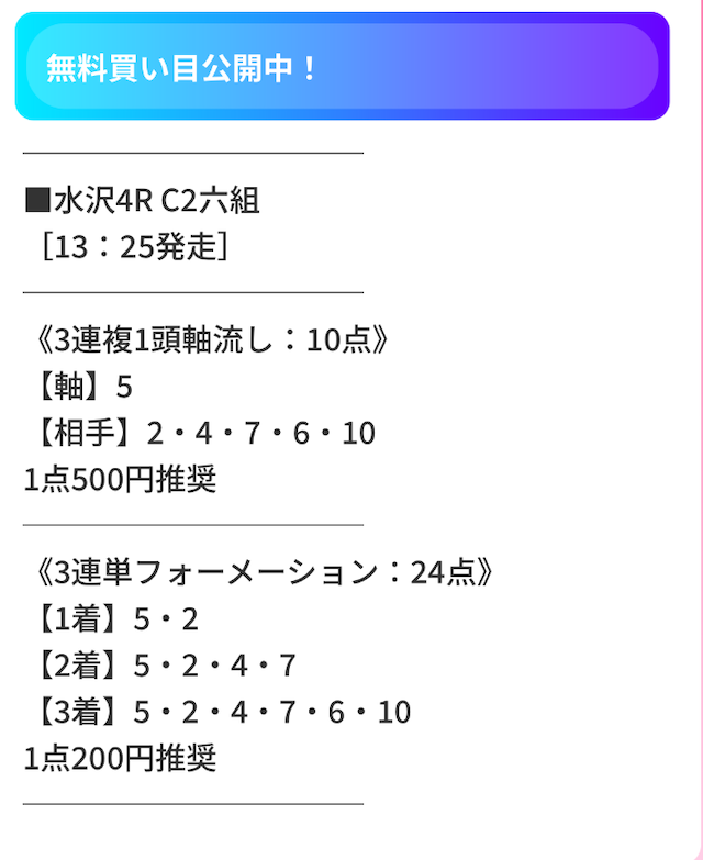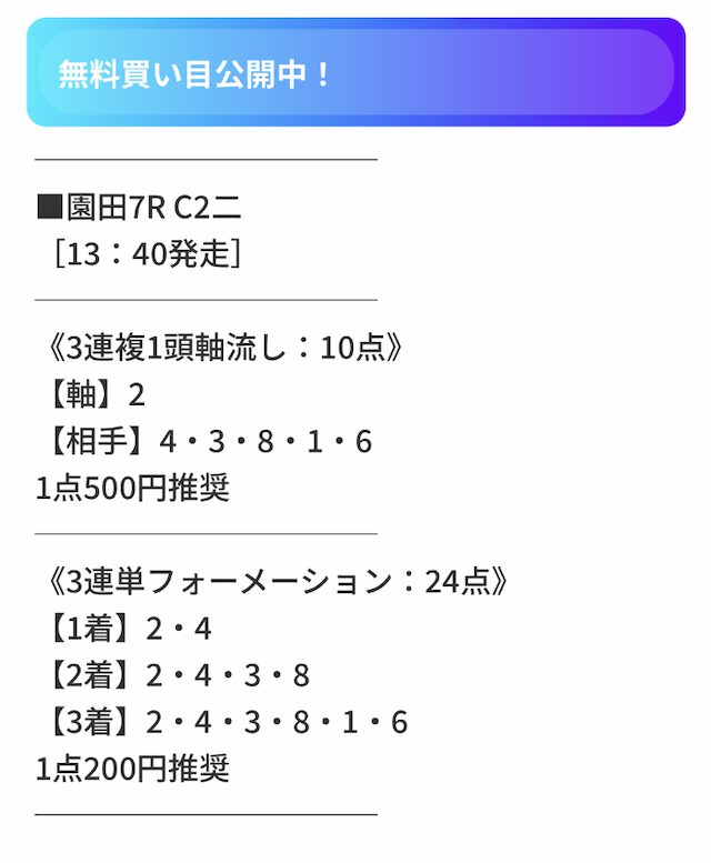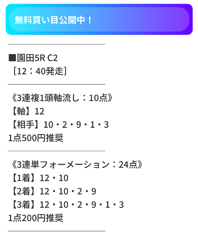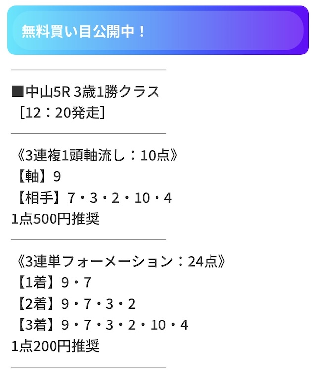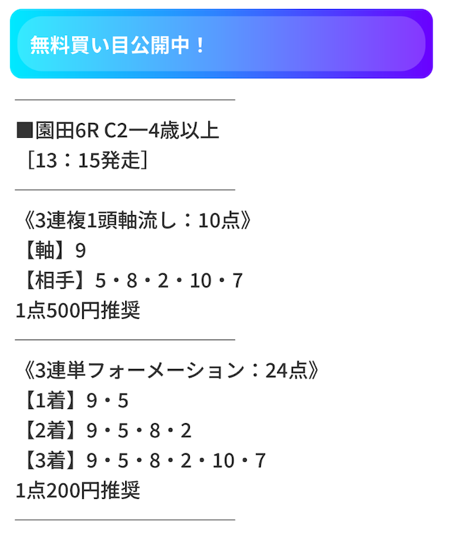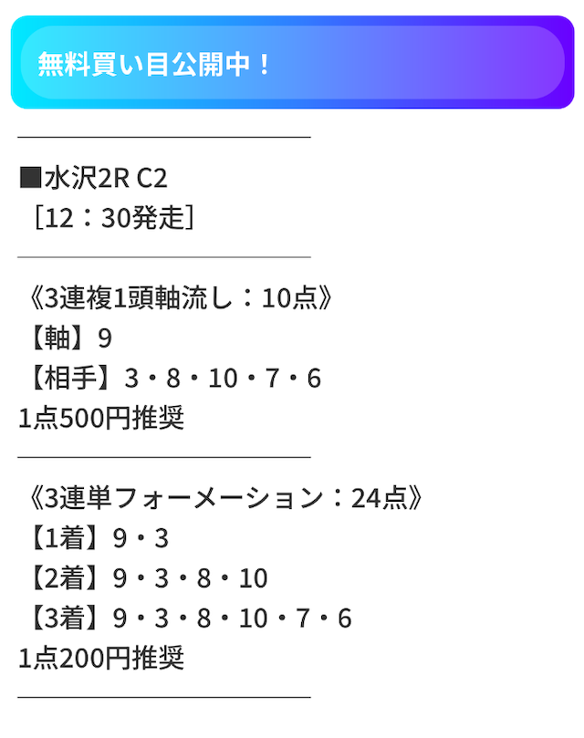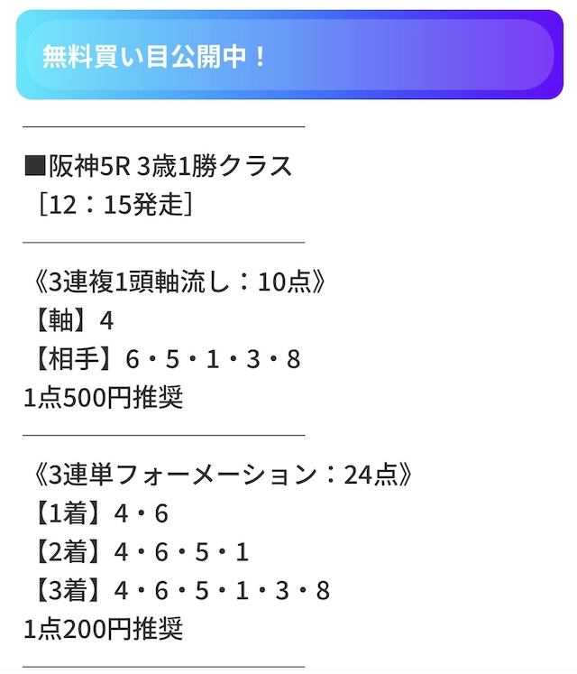 1度に3連複(15点)と3連単(20点)の2通りの予想が公開されます。