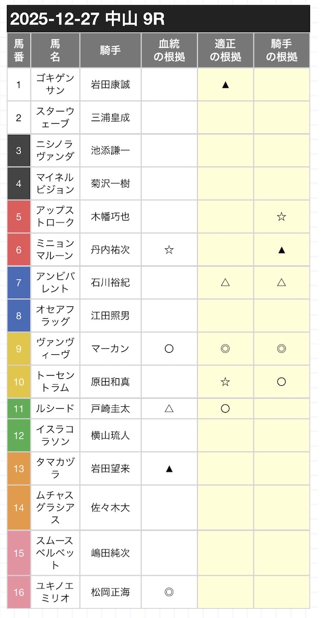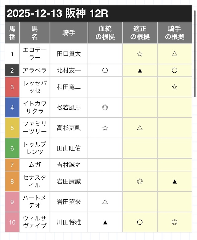 もし数字に被りがあれば6頭を選ぶ。 - スコア→◎5点、◯4点、▲3点、△2点、☆1点