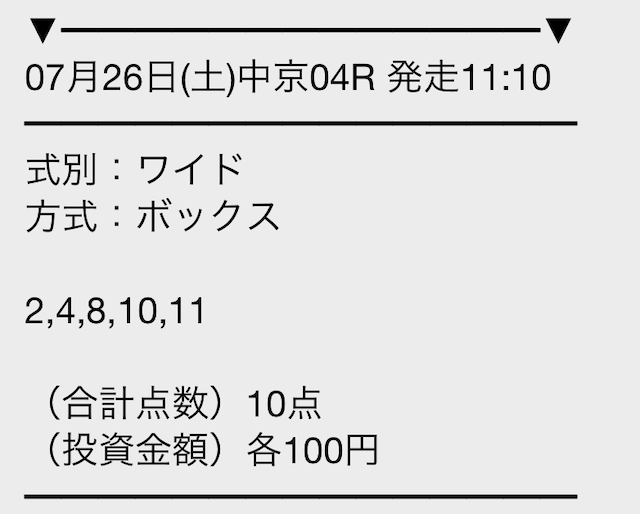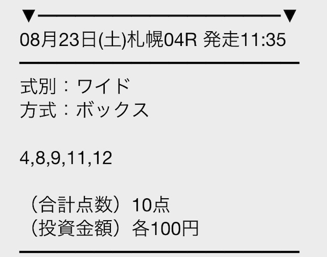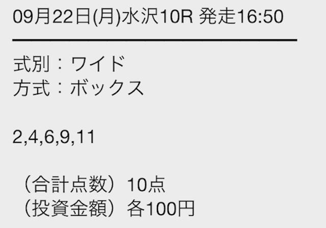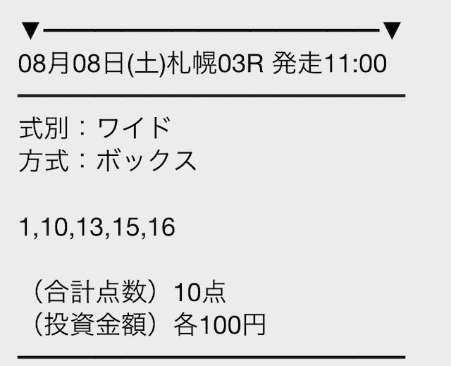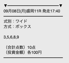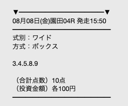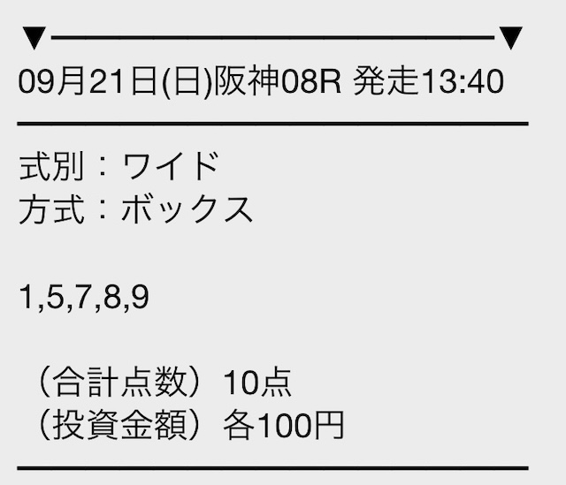 69戦57勝12敗 | 82% | 208% | ワイド | 10点 |