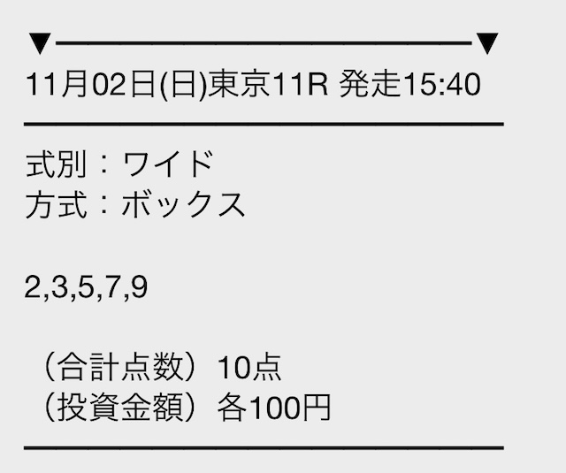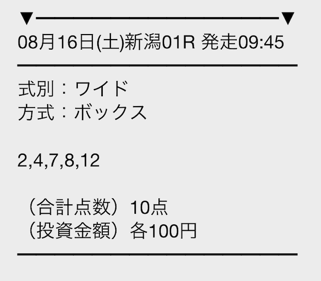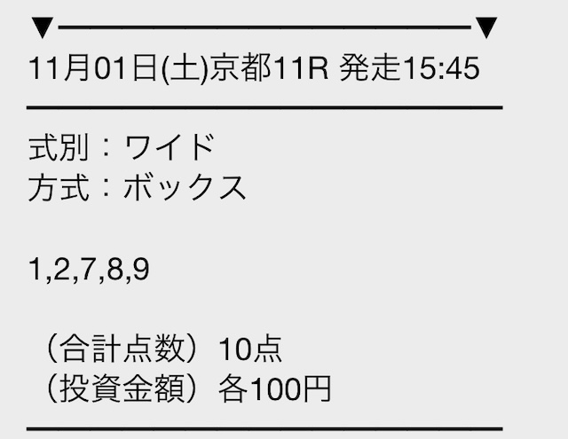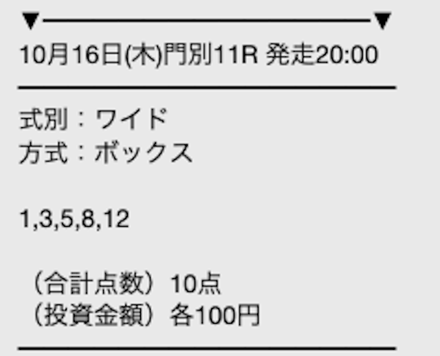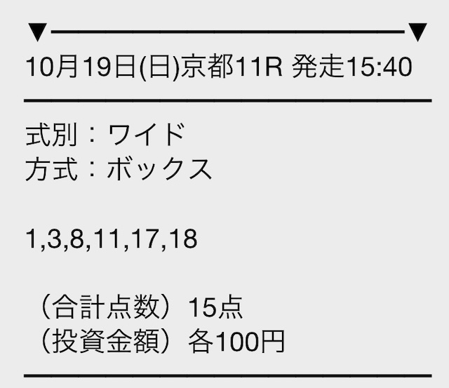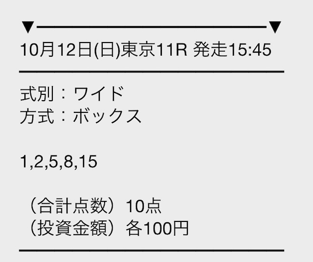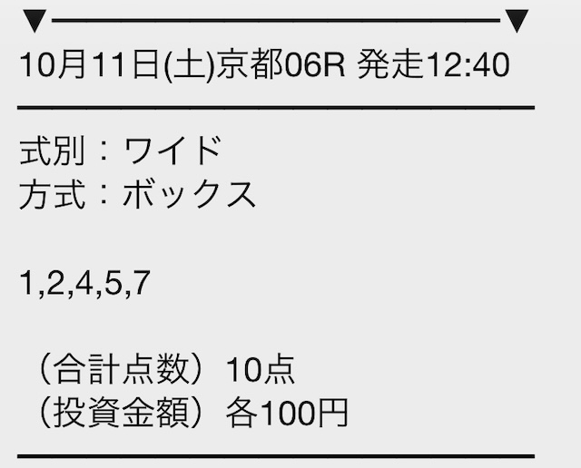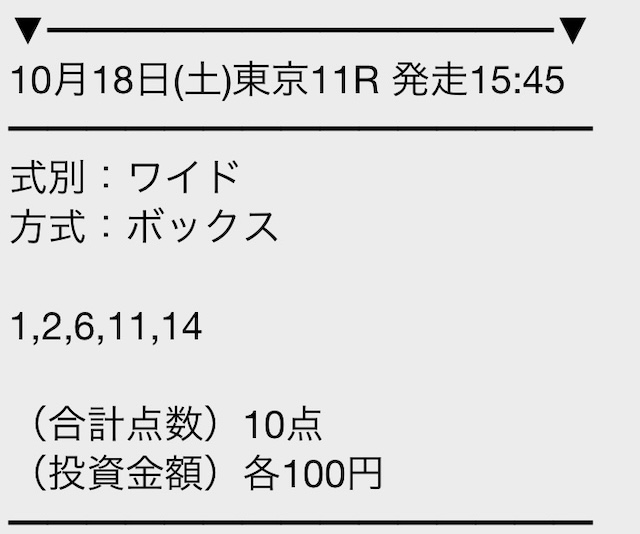 | 2023/10/14 新潟2R:的中 | 陣営のカラクリ | +1,134,780円 | 473% | 情報料金:300,000円 馬券代:3,600円 (合計303,600円) | 3連単:6点 2397.3倍 |