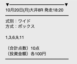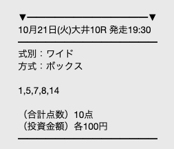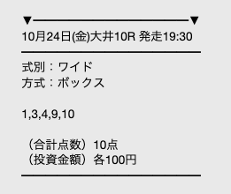 1点あたりの推奨投資金額は100円ですが、馬ラボはまとまった払戻が欲しいため、1点1,000円で購入して勝負していきます!