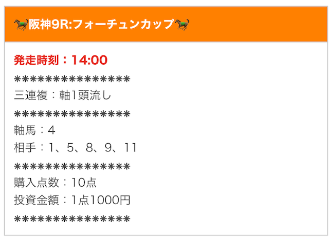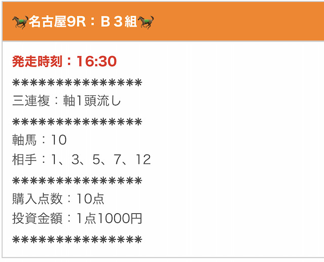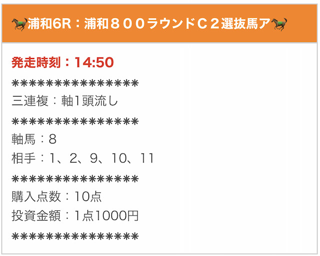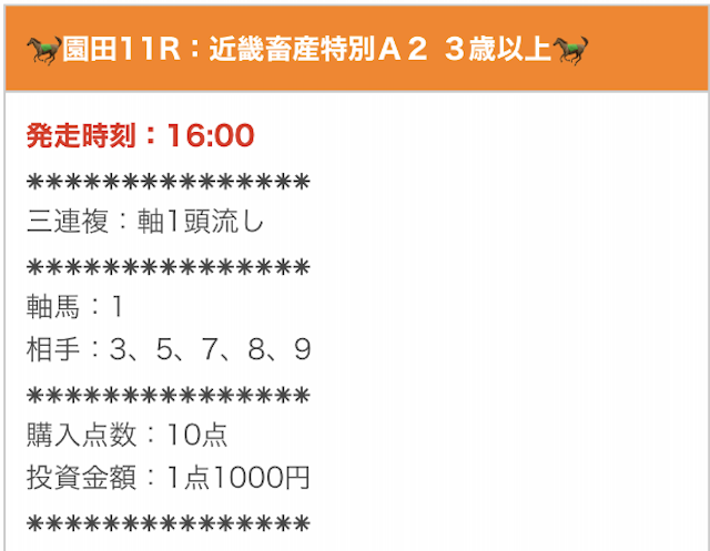 ★★★☆☆3.0 みさ 競馬歴:半年〜1年 30代女性 サイトも使いやすく、的中率も70%超えで満足! 回収率も安定していて、200%は超えています。 1日に複数の馬券予想があれば、尚嬉しいなと思い、期待を込めて★3とさせていただきます!口コミを見る限り、かなり優秀な成績だとは思いますが・・・