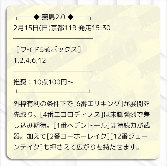上記馬を外した時点で不的中となる中で、なかなか強気な予想です。