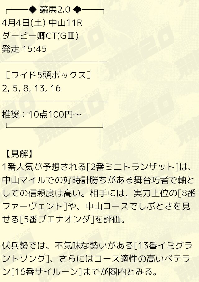 競馬2.0は、人気馬4頭と中穴馬1頭を選択。