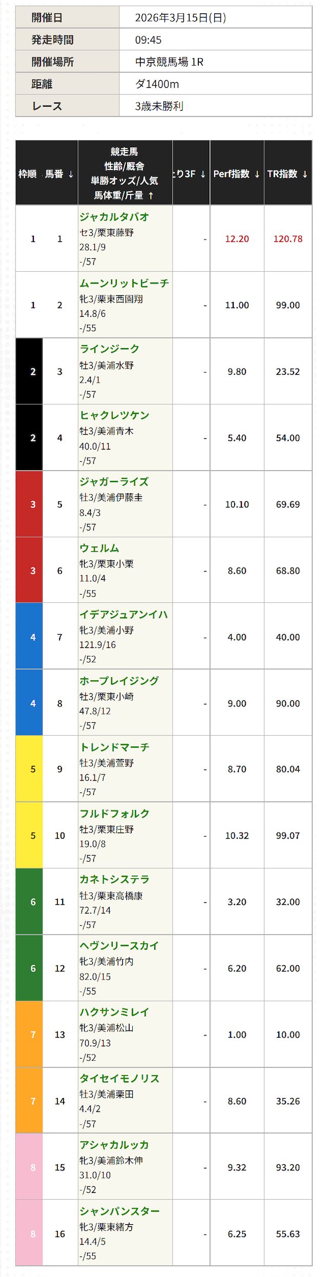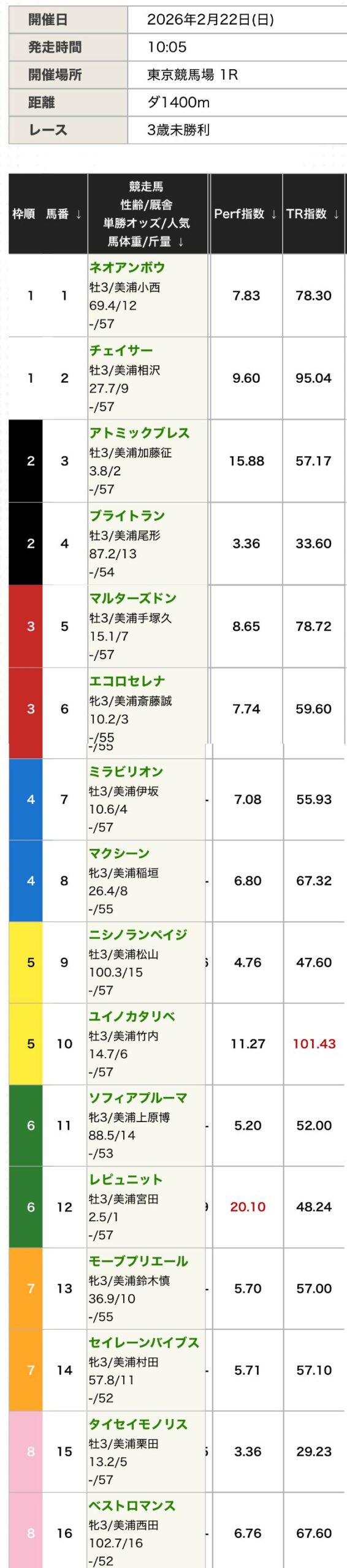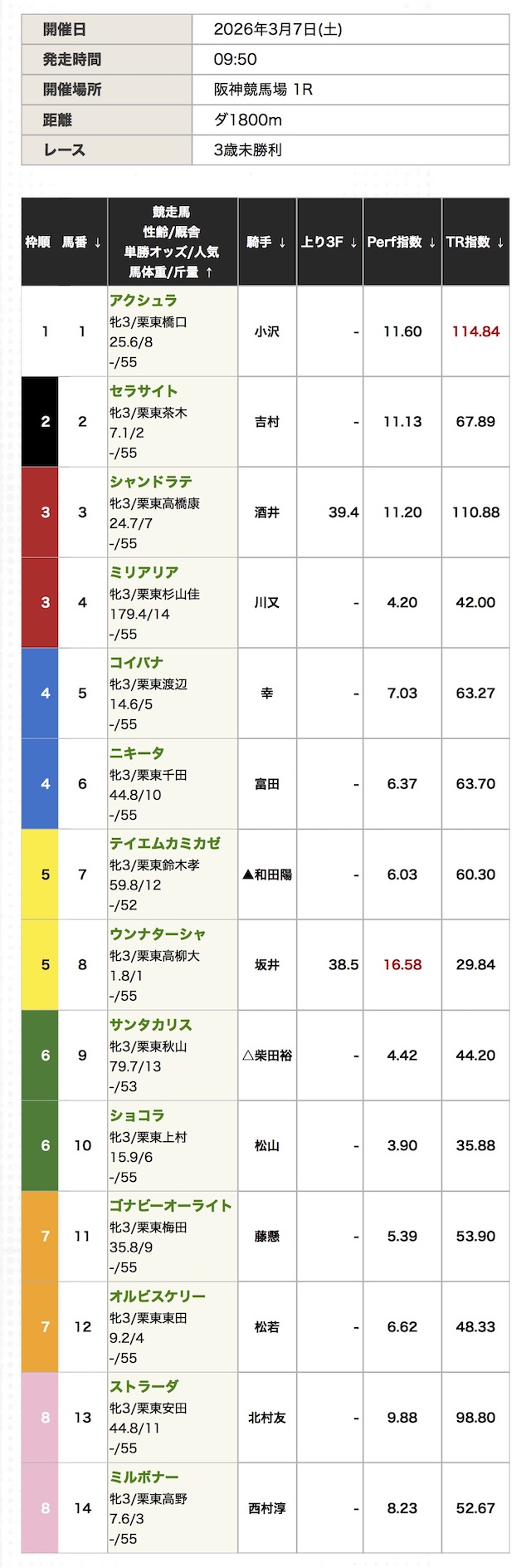 | TR指数 | パフォーマンス指数と バリュー指数を軸に コース適性・距離適性・枠順 ・展開想定などを加味して 算出する総合指数。 |