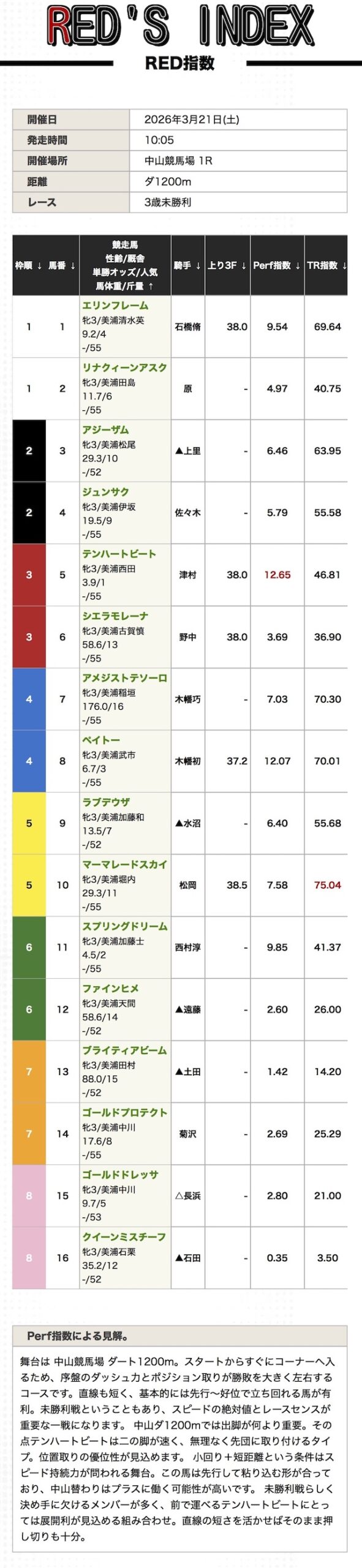 | Perf指数 | 直近レースを中心に 着順・上がりタイム・通過順位 レースレベルなどの実走データを 多角的に評価し算出した指数。 |