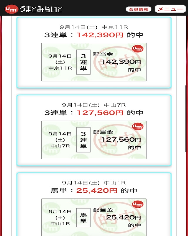 ★★★★☆4.0 るきあ 競馬歴:5年以上 40代男性 まず、感じたのは当たる安心感!これまで回収率重視の予想サイトを使っていましたが、当たらないし精神的に負荷がかかっていました。しかし、うまとみらいとではこんな心配は全く必要ありません。今後もよろしく頼みます! -