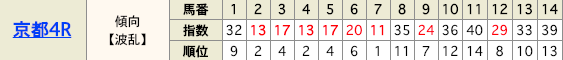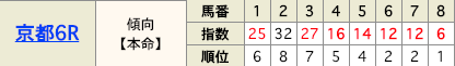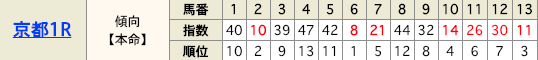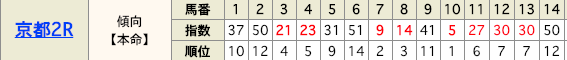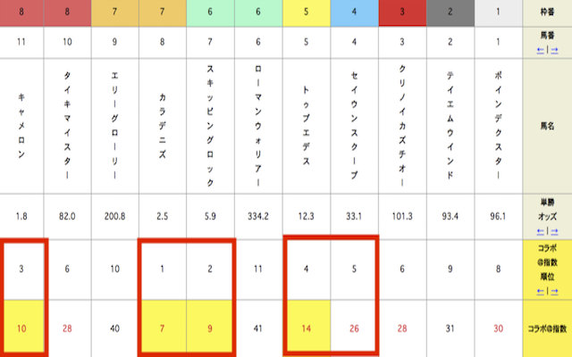 実際に公開された買い目がこちらです。(指数が低いほど、馬券に絡みやすくなります。)