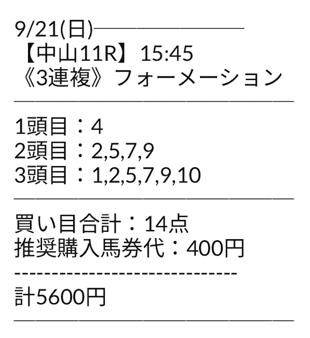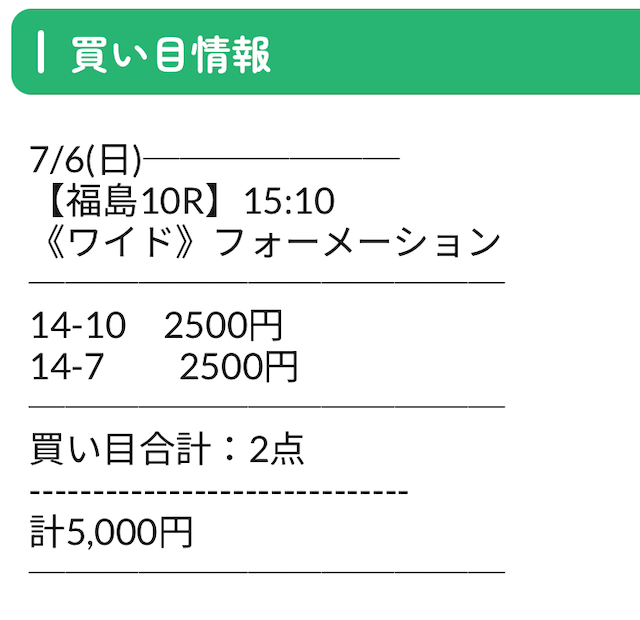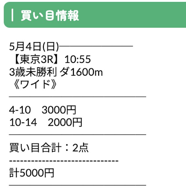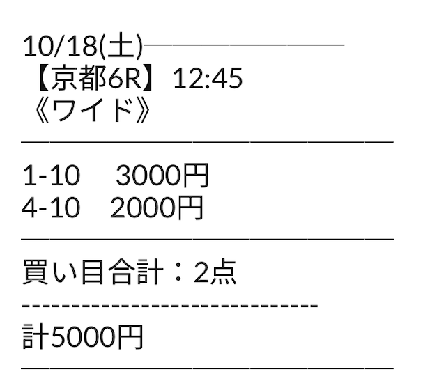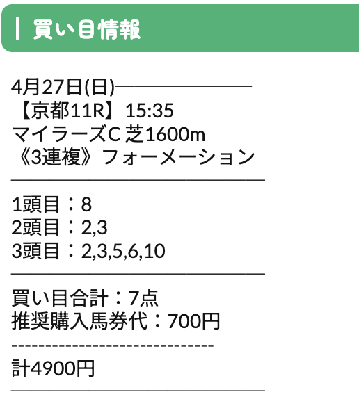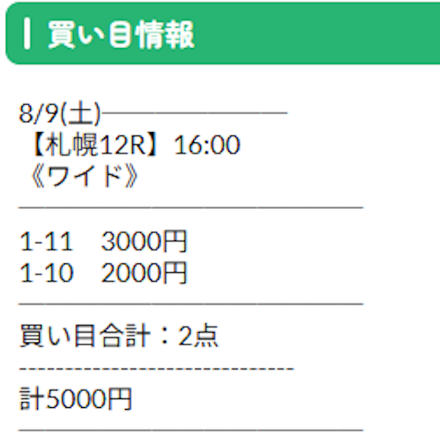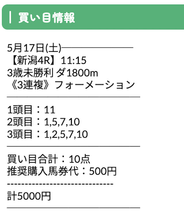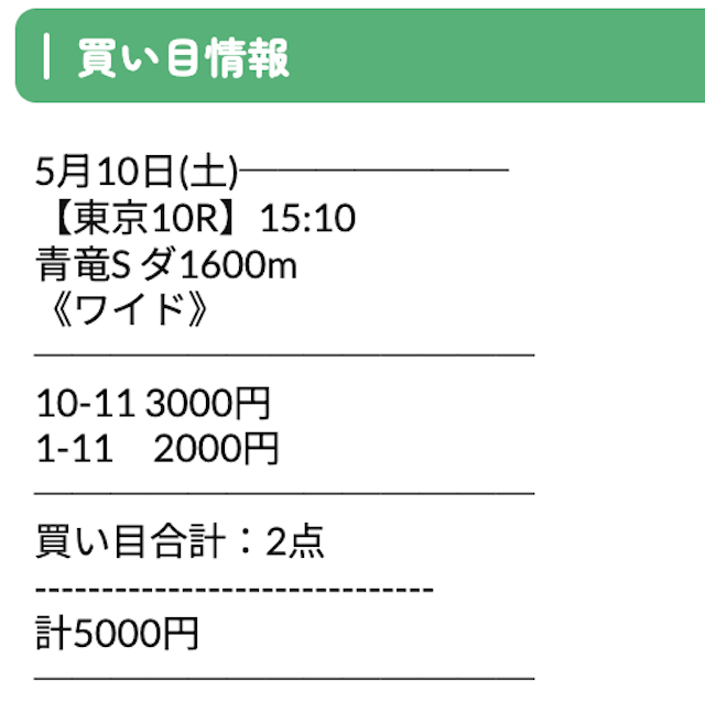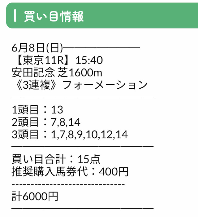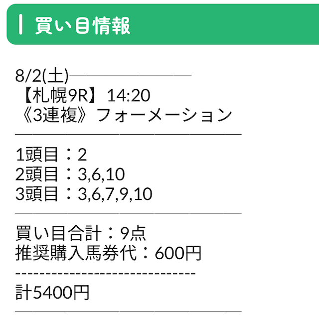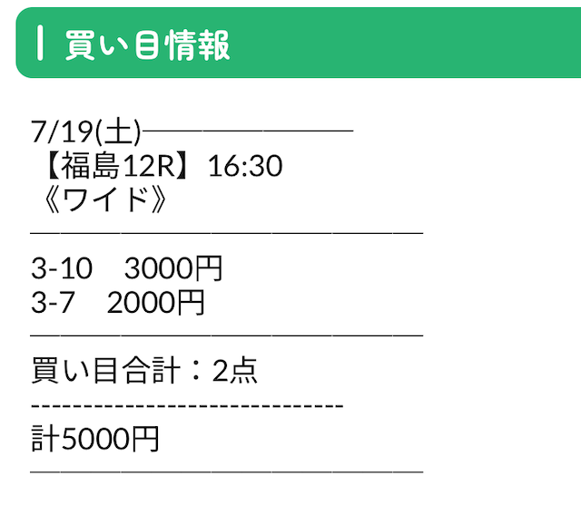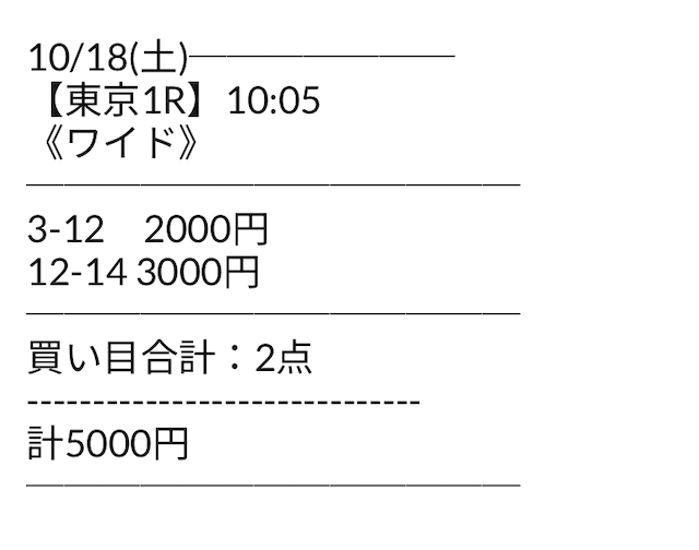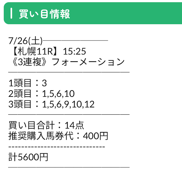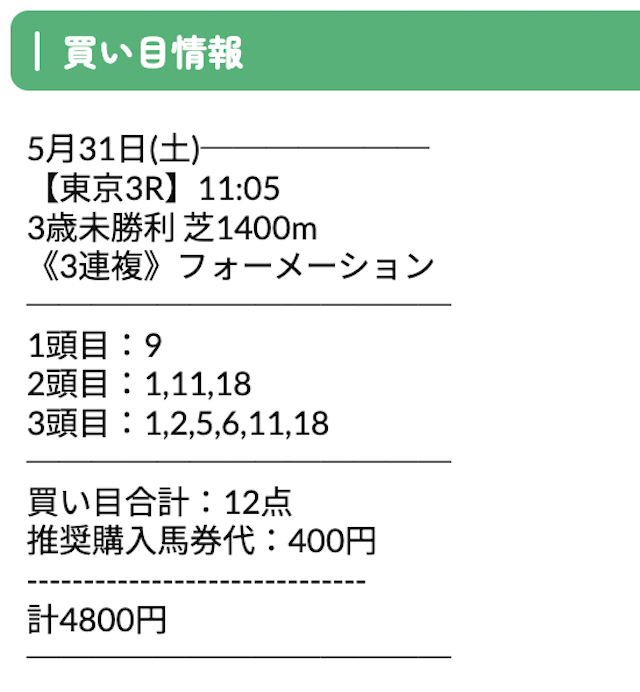 ★★★☆☆3.0 ちゃん 競馬歴:半年〜1年 30代女性 今のところ、的中率90%超え!競馬は始めたばかりだが、初心者でも楽々プラス。本当に感謝!全然不満とかではないのですが、点数が多いと分かりづらく感じるため、少ない買い目を多めに提供してくれるともっと嬉しい!