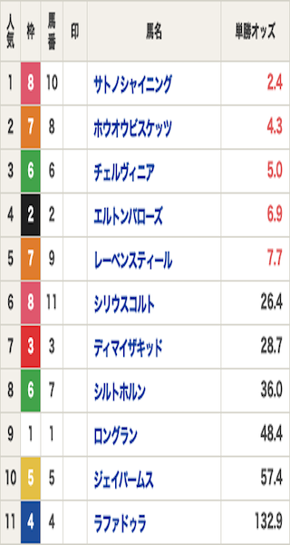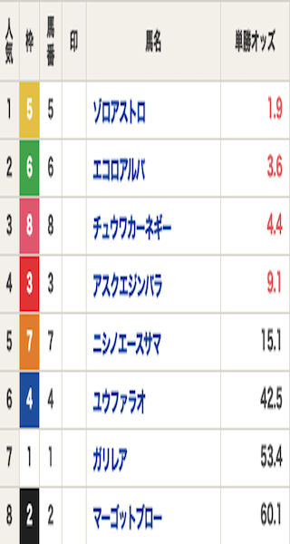 本レースは、人気上位4頭に注目が集まるフルゲート戦。