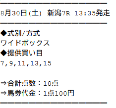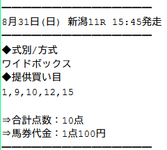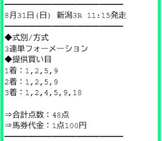 2025/8/31 新潟3R:的中 | 荒波突破フォーメーション | +384,350円 | 553% | 情報料金:80,000円 馬券代:4,800円 (合計84,800円) | 3連単:48点 4691.5倍 |