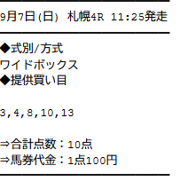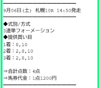 2025/9/6 阪神4R:的中 | 極上トライアル | +184,760円 | 1042% | 情報料金:14,800円 馬券代:4,800円 (合計19,600円) | 3連単:4点 170.3倍 |