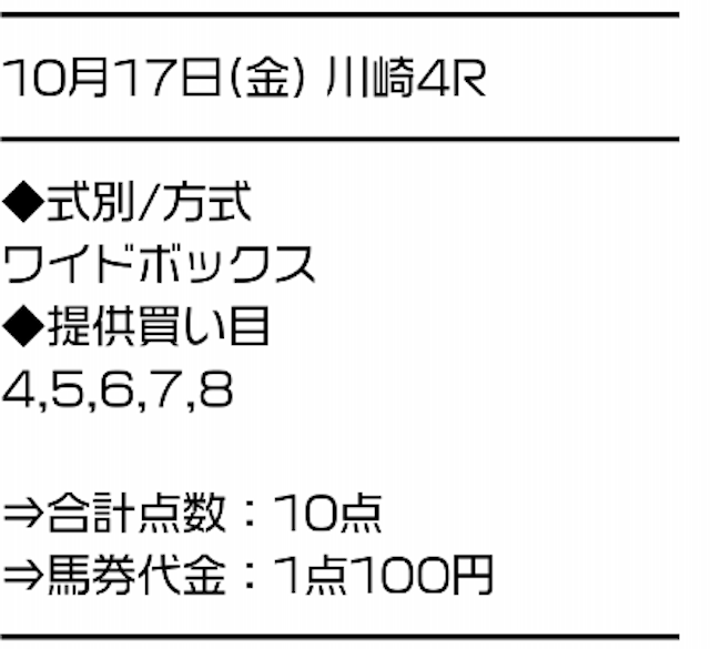 買い目は4点で、1点あたりの購入金額は1,200円とかなり強気な予想です。