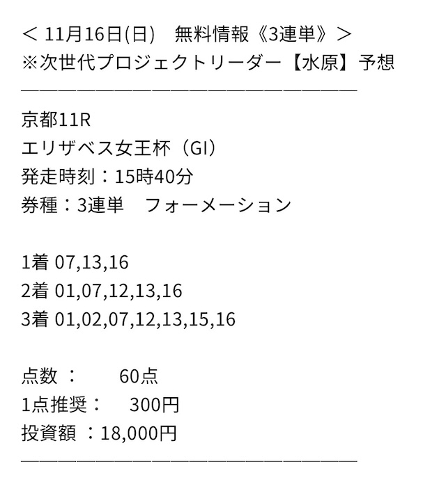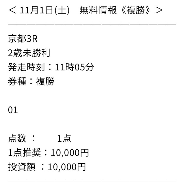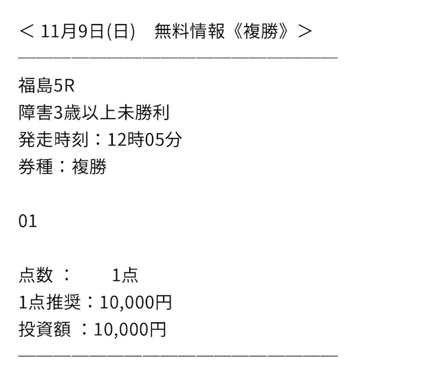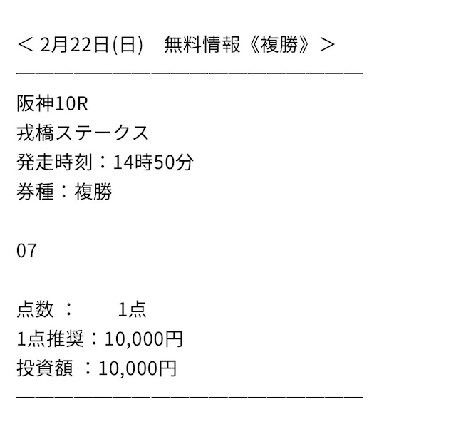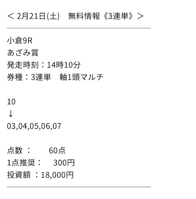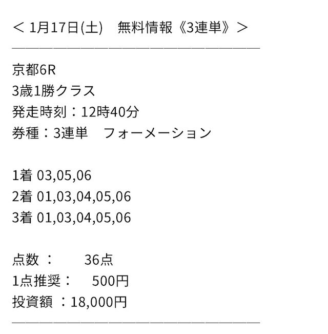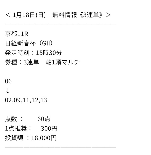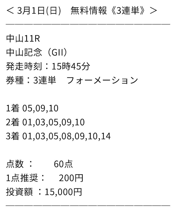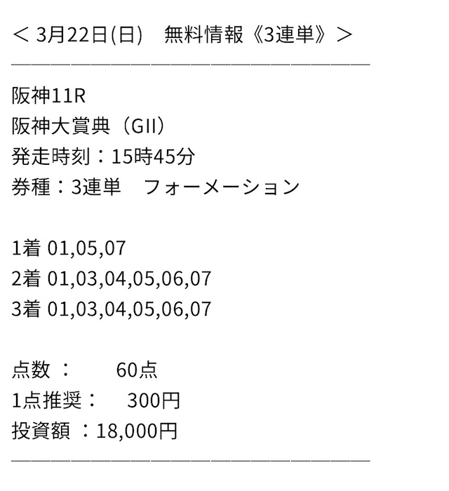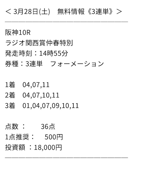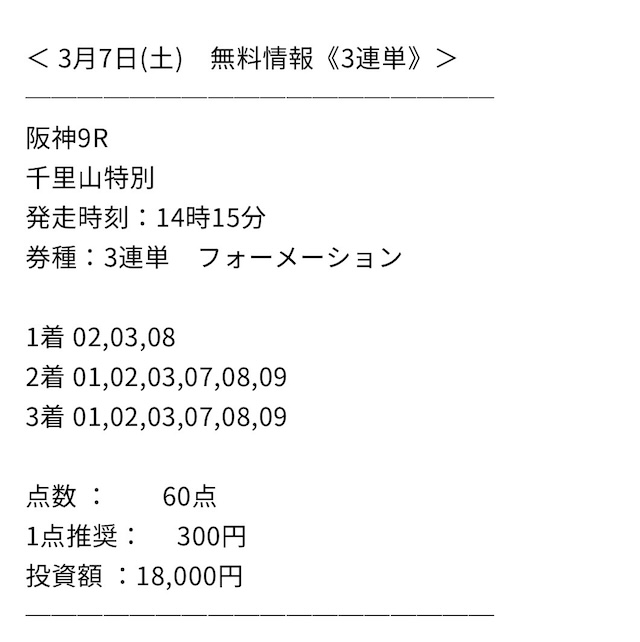 | 2023/3/18 中京11R:的中 | 📷Victory Road | +4,092,750円 | 5,784% | 情報料金:42,000円 馬券代:30,000円 (合計72,000円) | 3連単:30点 |