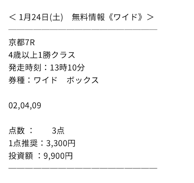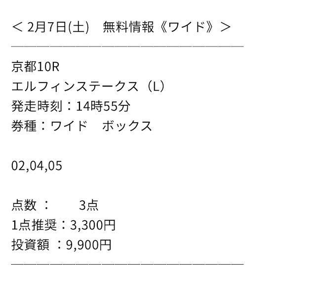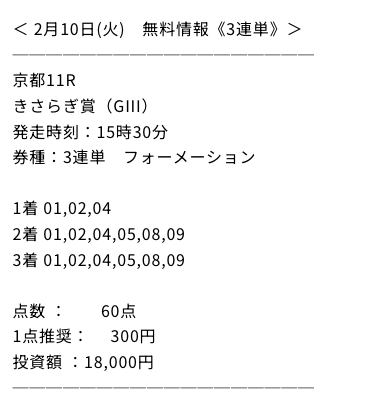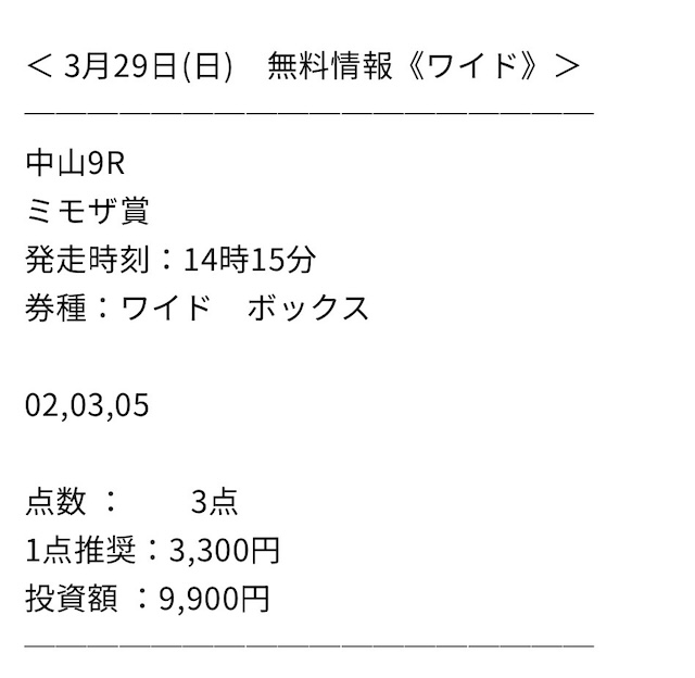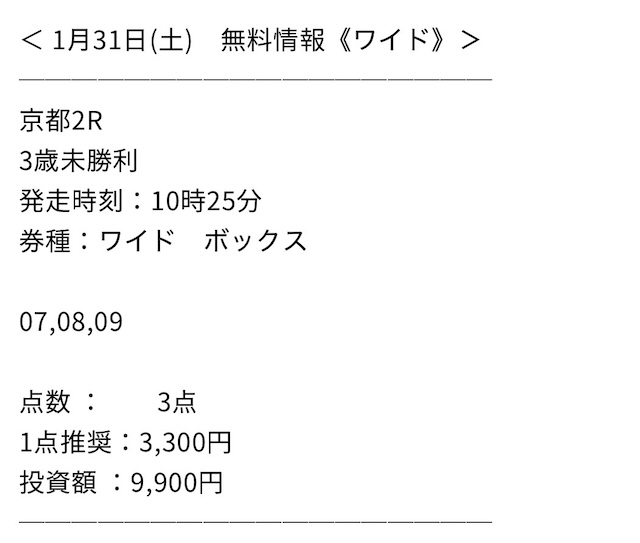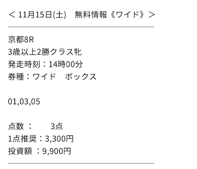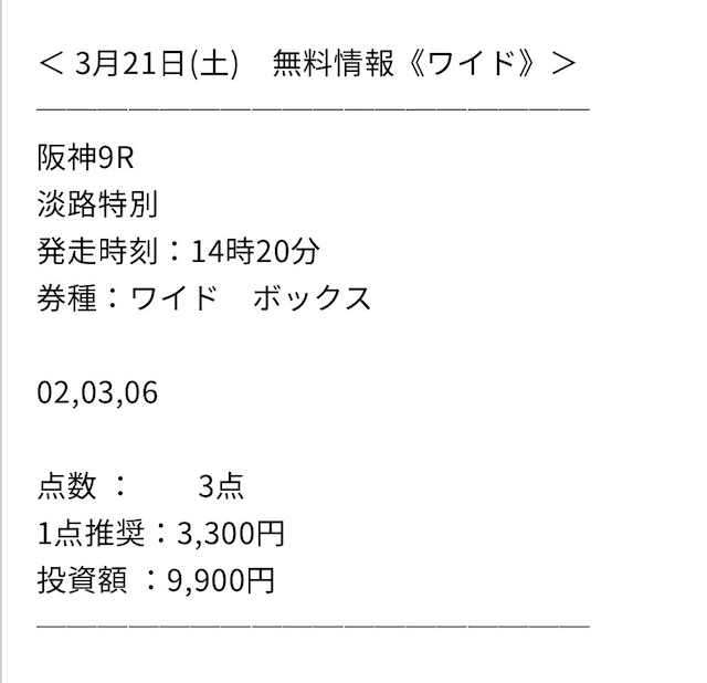 ワイドについては、3点買いで、その他の券種についてはレースごとに異なる点数で無料予想が提供されています。