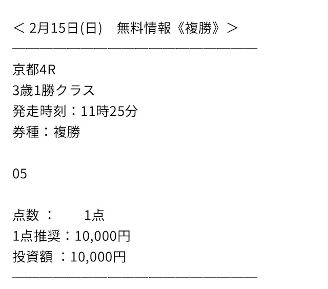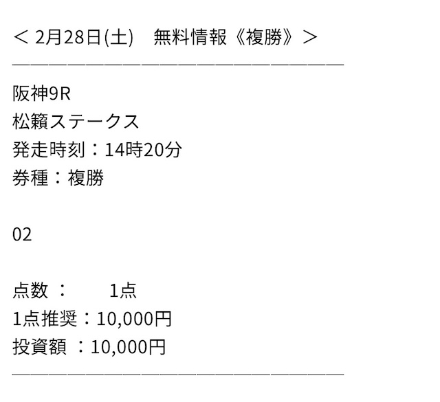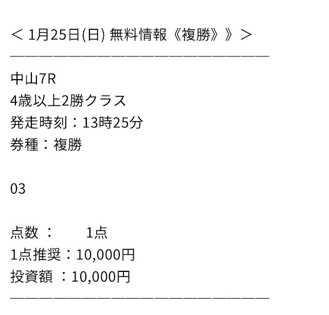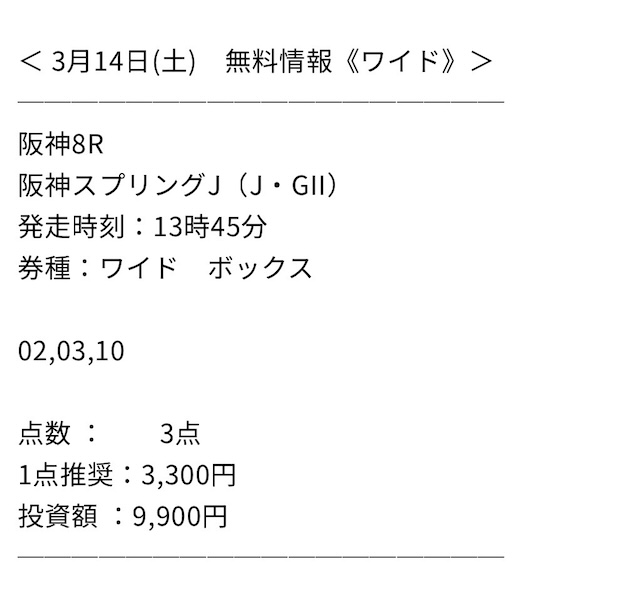 | 2023/3/25 中山4R:的中 | 📷血統新書[プラチナ] | +1,242,400円 | 1,600% | 情報料金:64,800円 馬券代:18,000円 (合計82,800円) | 3連単:18点 |