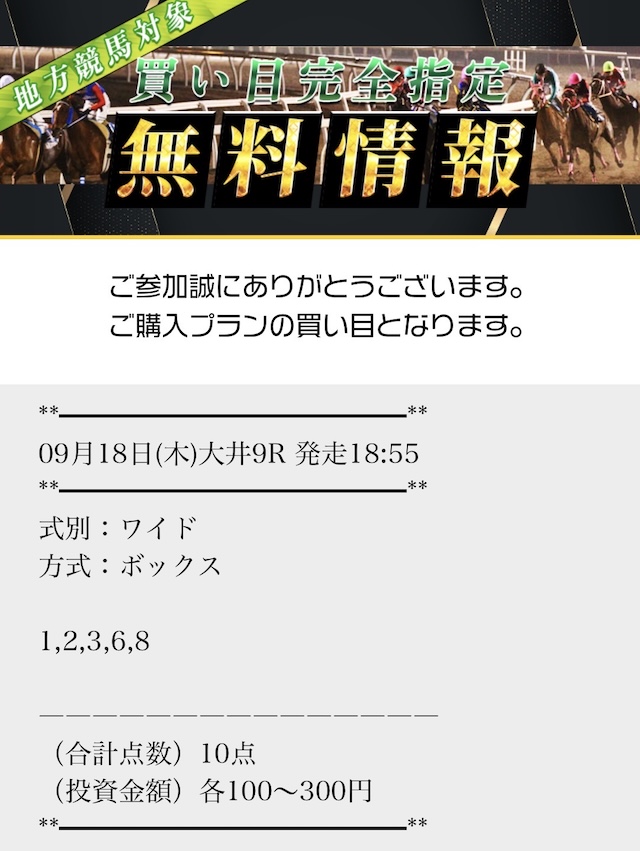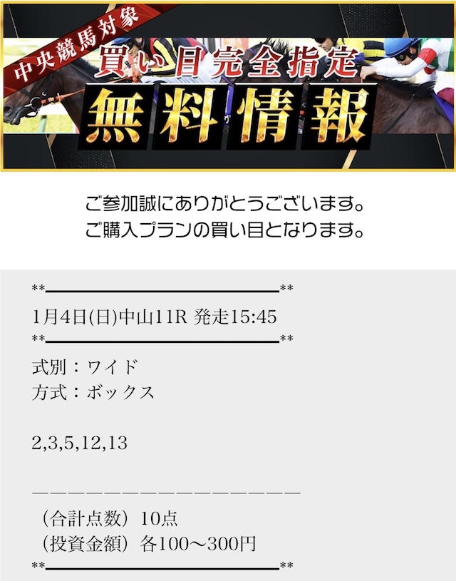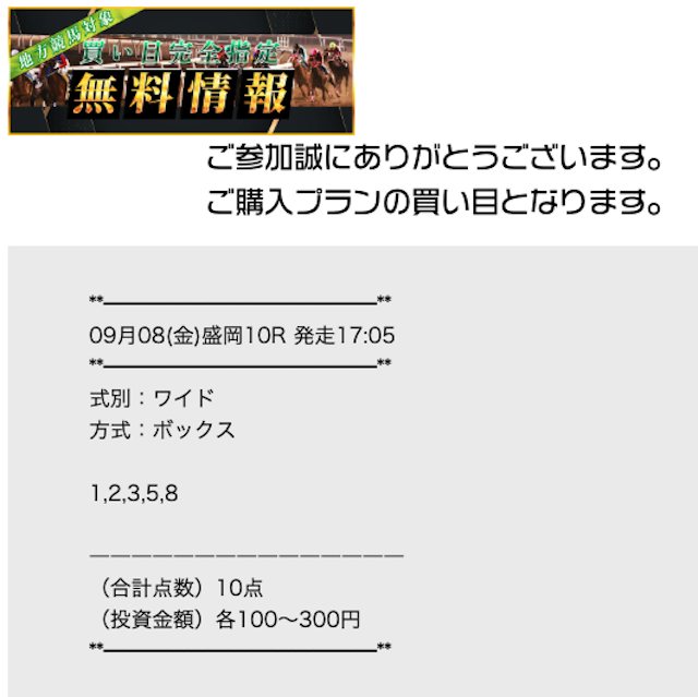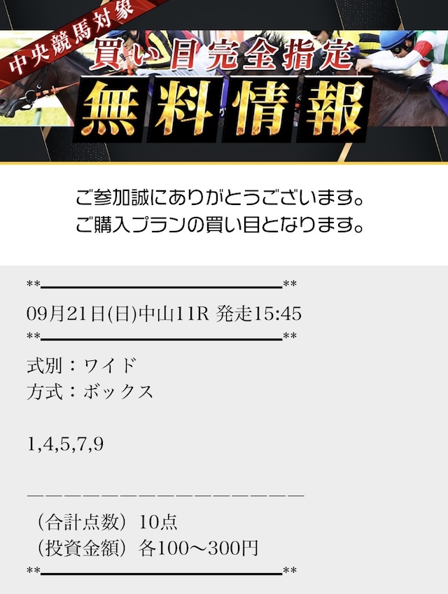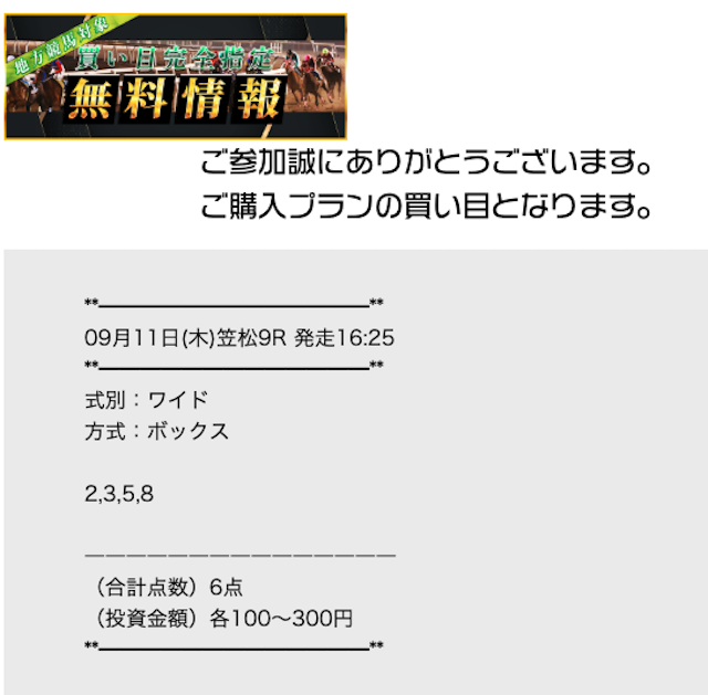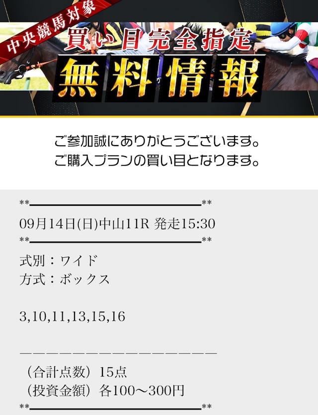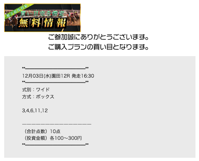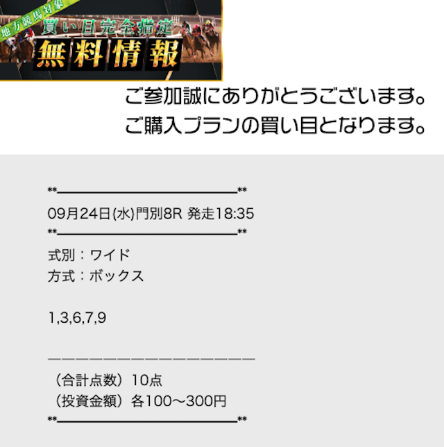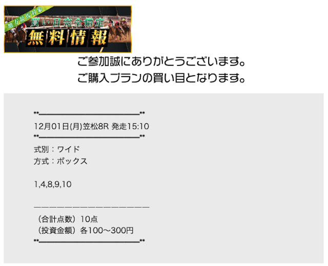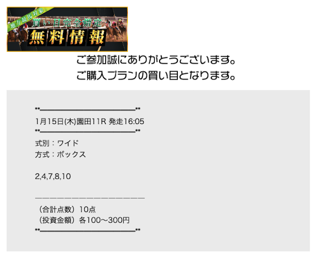 情報料金は高いですが、無料予想が2、3回当たれば購入費は賄えるので、案外手が出しやすいプランだったりします。