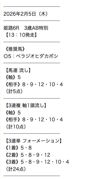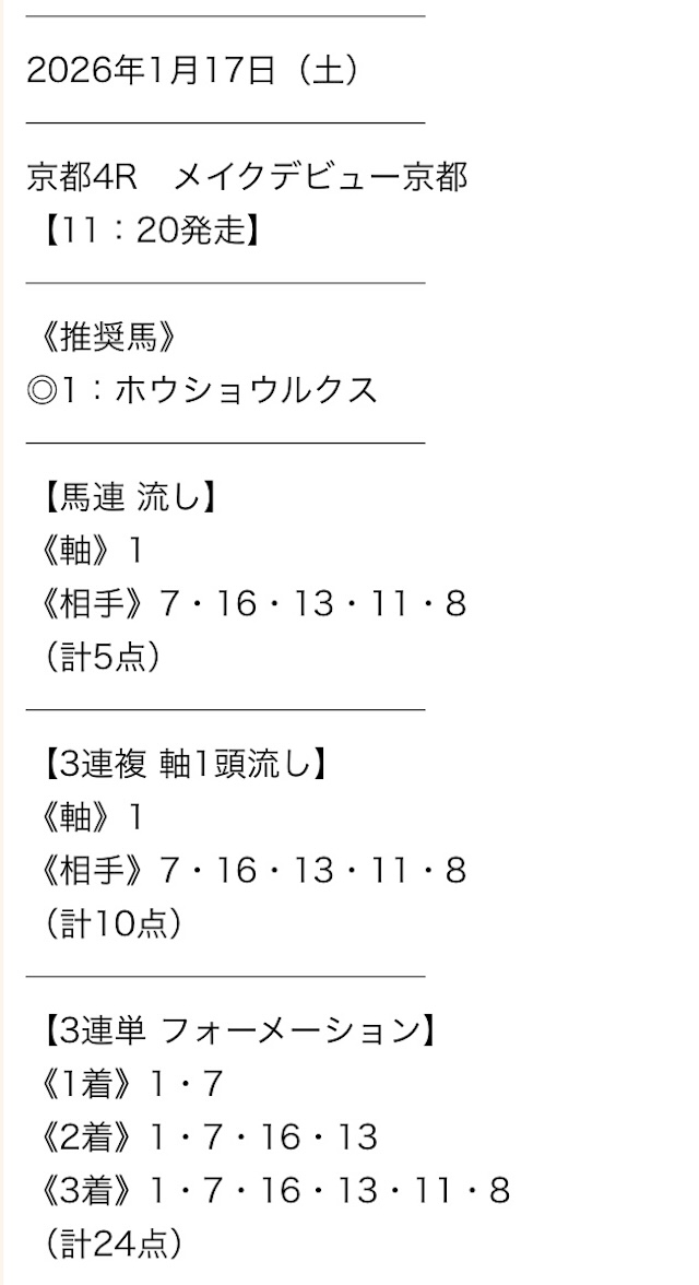 71戦58勝13敗 | 81% | 204% | ワイド | 10点 |