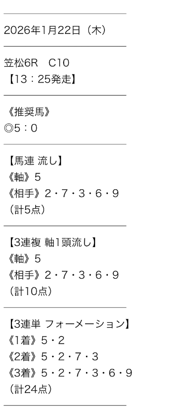 | 2023/4/29 京都10R:的中 | 5分後の世界 | +241,440円 | 160% | 情報料金:380,000円 馬券代:19,200円 (合計399,200円) | 3連単:24点 800.8倍 |