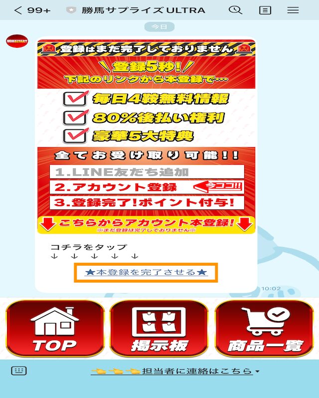 その後、勝馬サプライズウルトラを友達追加し、トークの『本登録を完了させる』からサイト内にログインします。