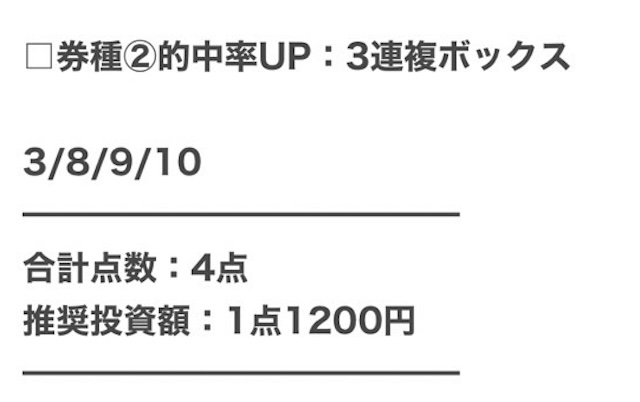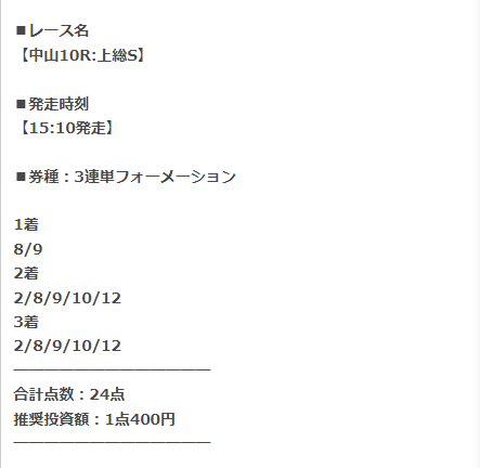 2023/03/04 中山10R:的中 | クイックラック | +80,000円 | 508% | 情報料金:10,000円 馬券代:9,600円 (合計19,600円) | 3連単:24点 249.0倍 |