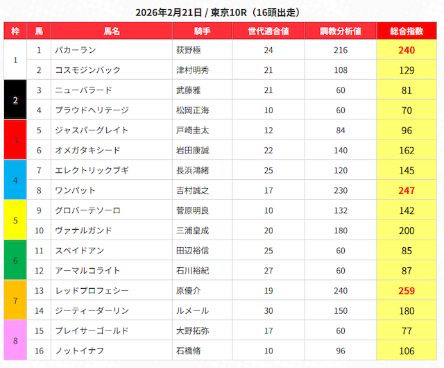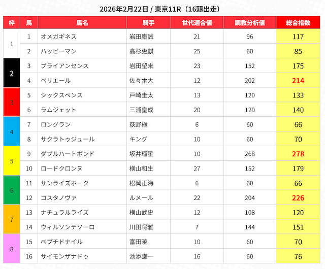 特に数値が高い3頭の指数は赤字で表示されていますが、3頭予想だと不安なので、ひとまず指数が高い馬を5頭選択します。