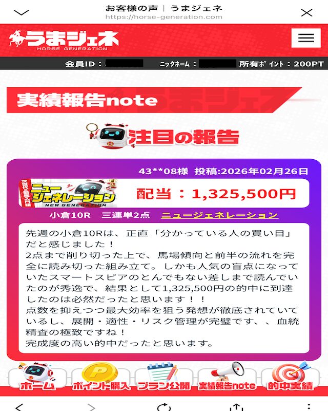 爆発力のある予想を公開しているうまジェネは、ユーザーからどう評価されているのか。