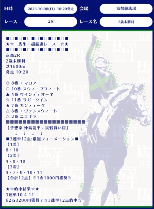 2023/10/8 京都2R:的中 | 最速帯封・エントリープラン | +581,200円 | 1483% | 情報料金:30,000円 馬券代:12,000円 (合計42,000円) | 3連単:12点 623.2倍 |