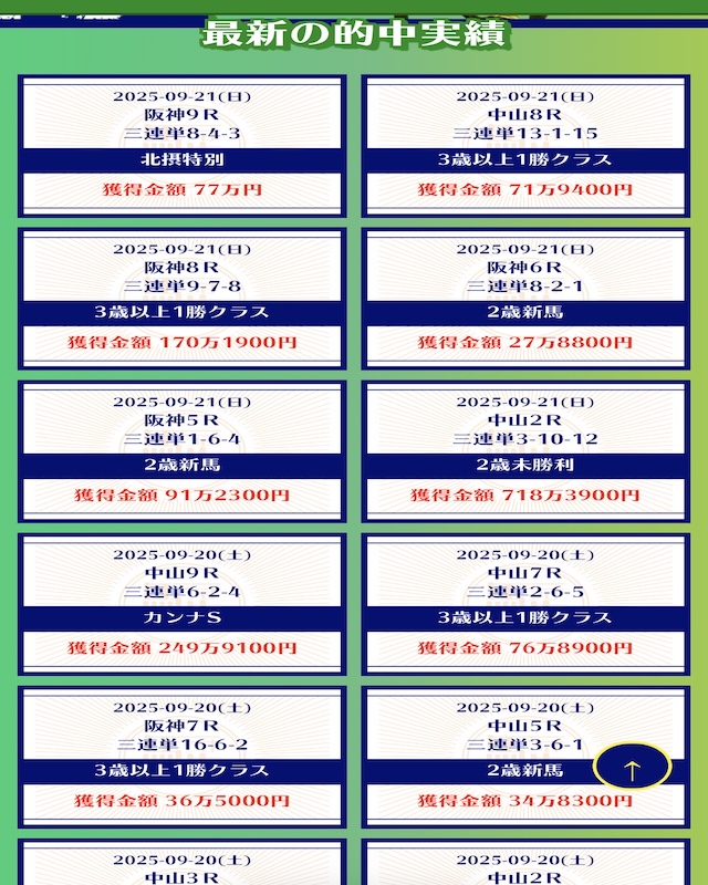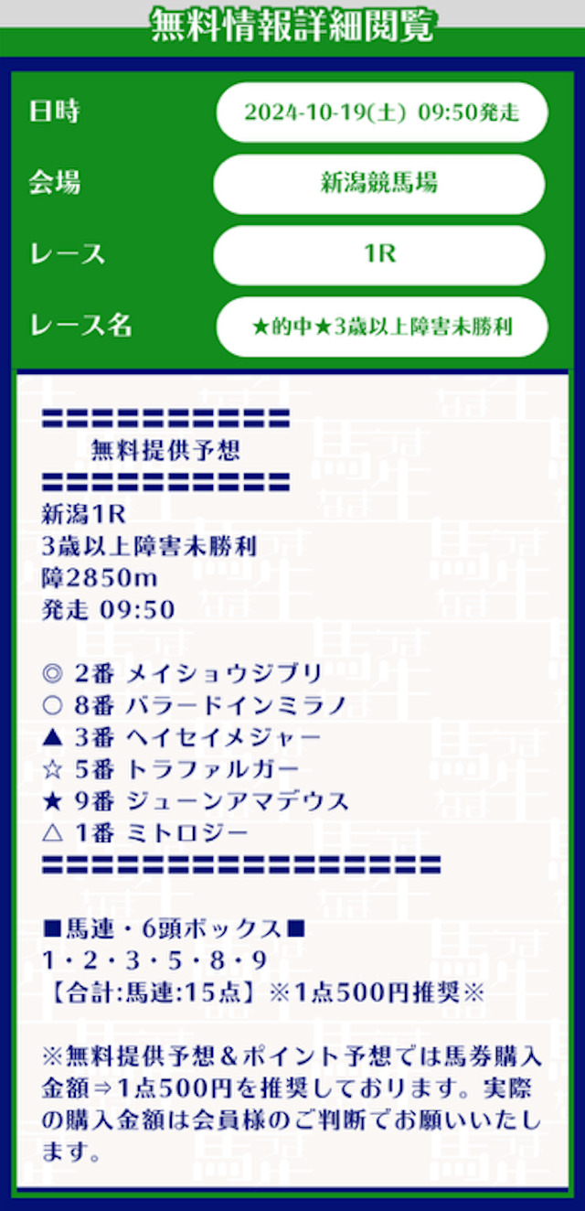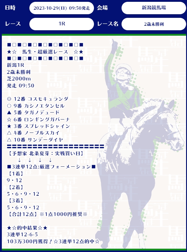 2023/10/29 新潟1R:的中 | 帯封連続直撃・ダイヤモンドプラン | +948,300円 | 1256% | 情報料金:70,000円 馬券代:12,000円 (合計82,000円) | 3連単:12点 1030.3倍 |