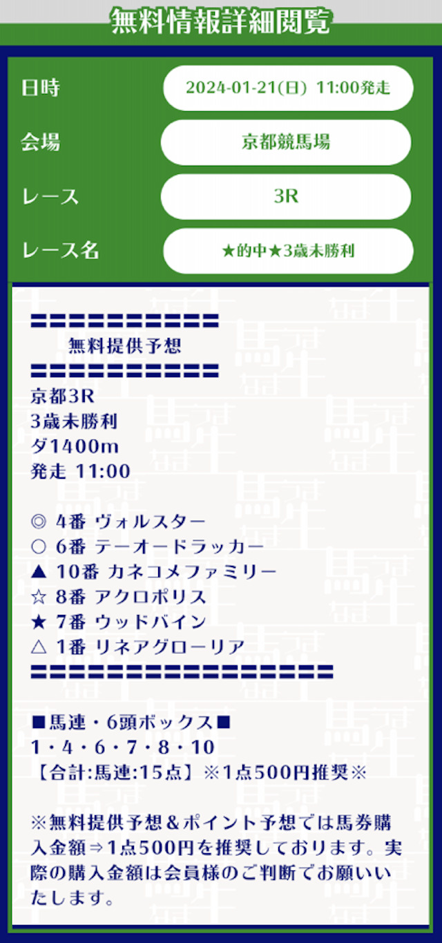 登録後いきなり有料予想を購入するのはおすすめしませんが、無料予想の確認だけならリスクはありません。