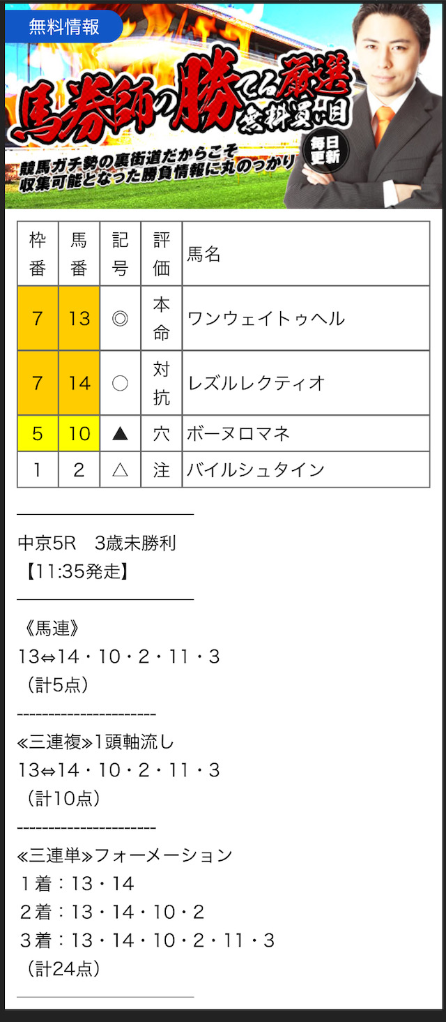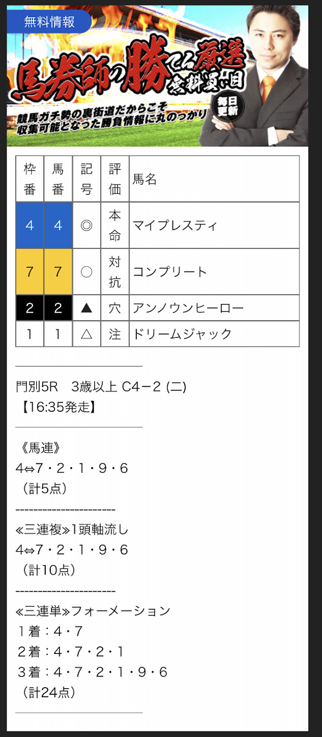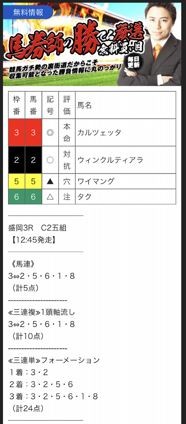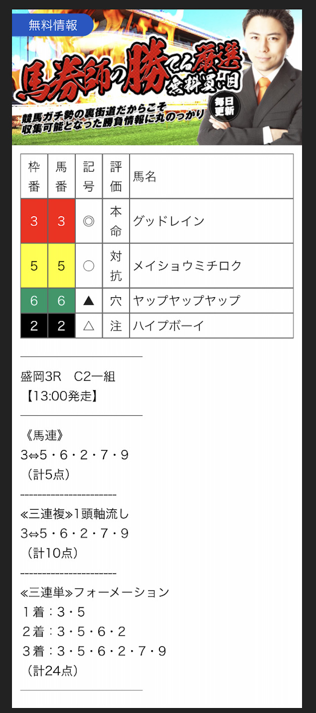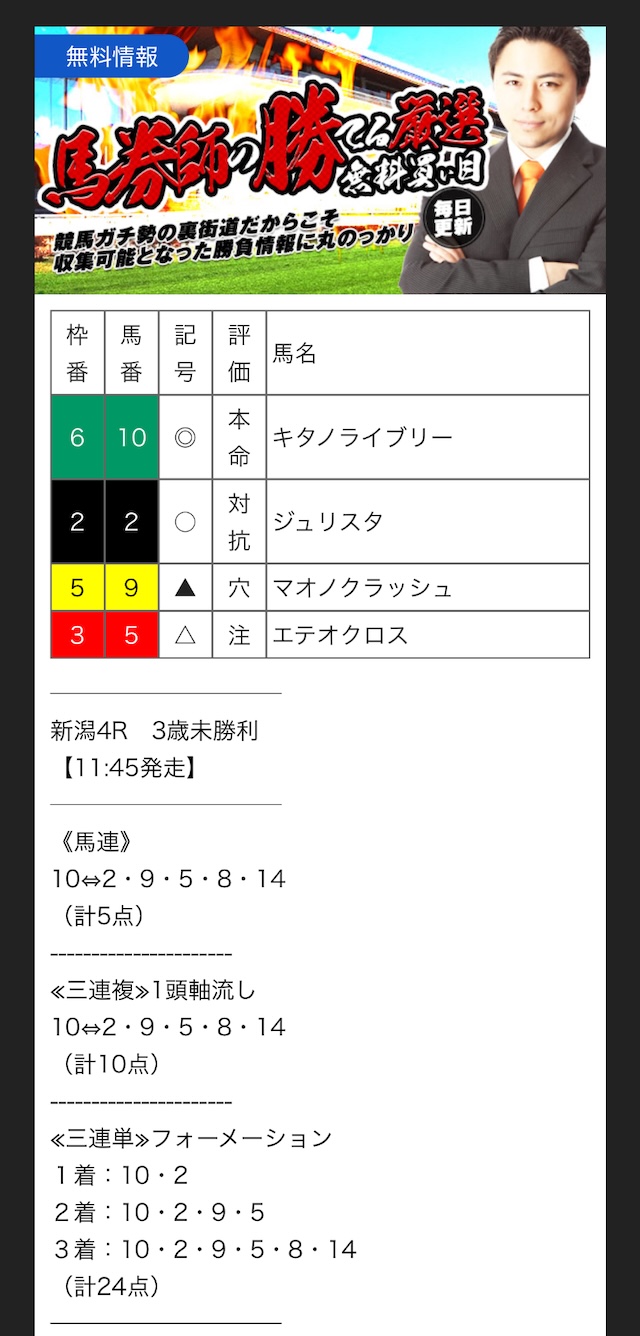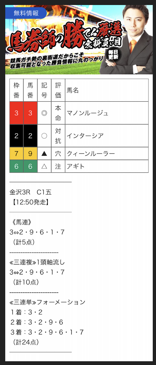 無料予想では、手堅く狙って当ててくれるので、競馬初心者の方にもオススメです。