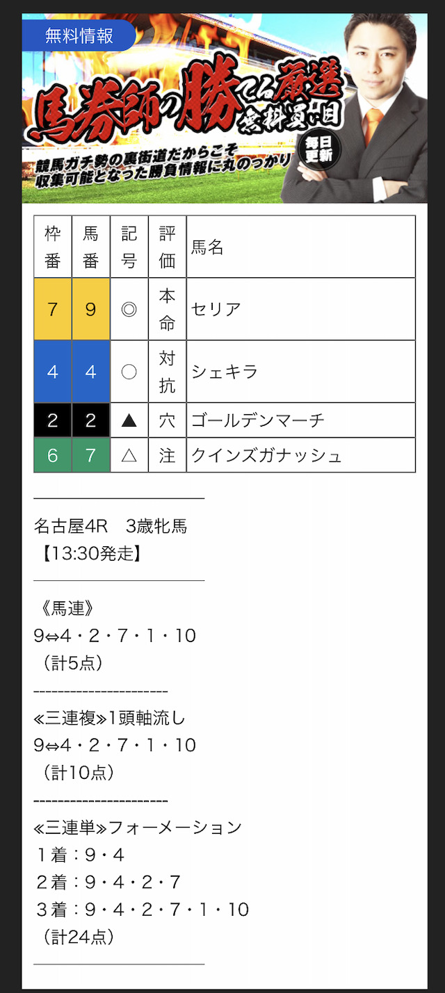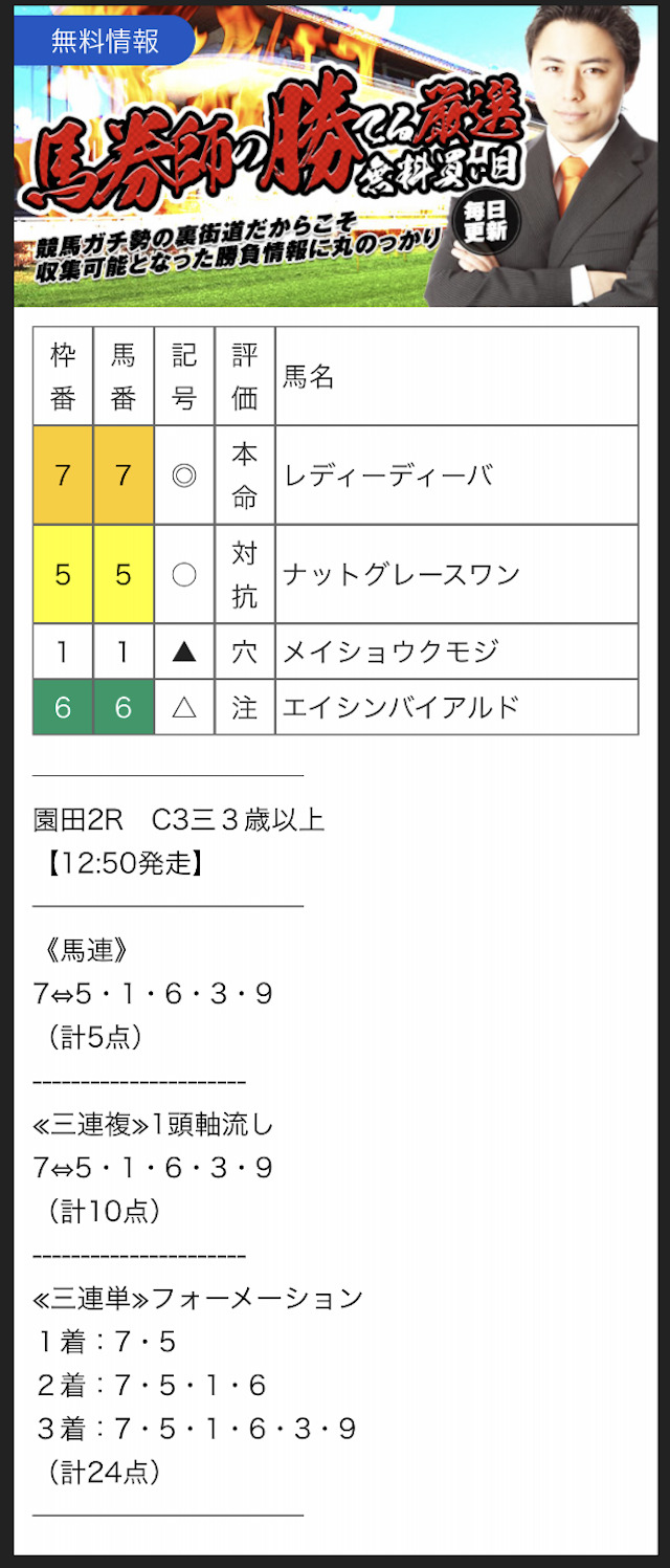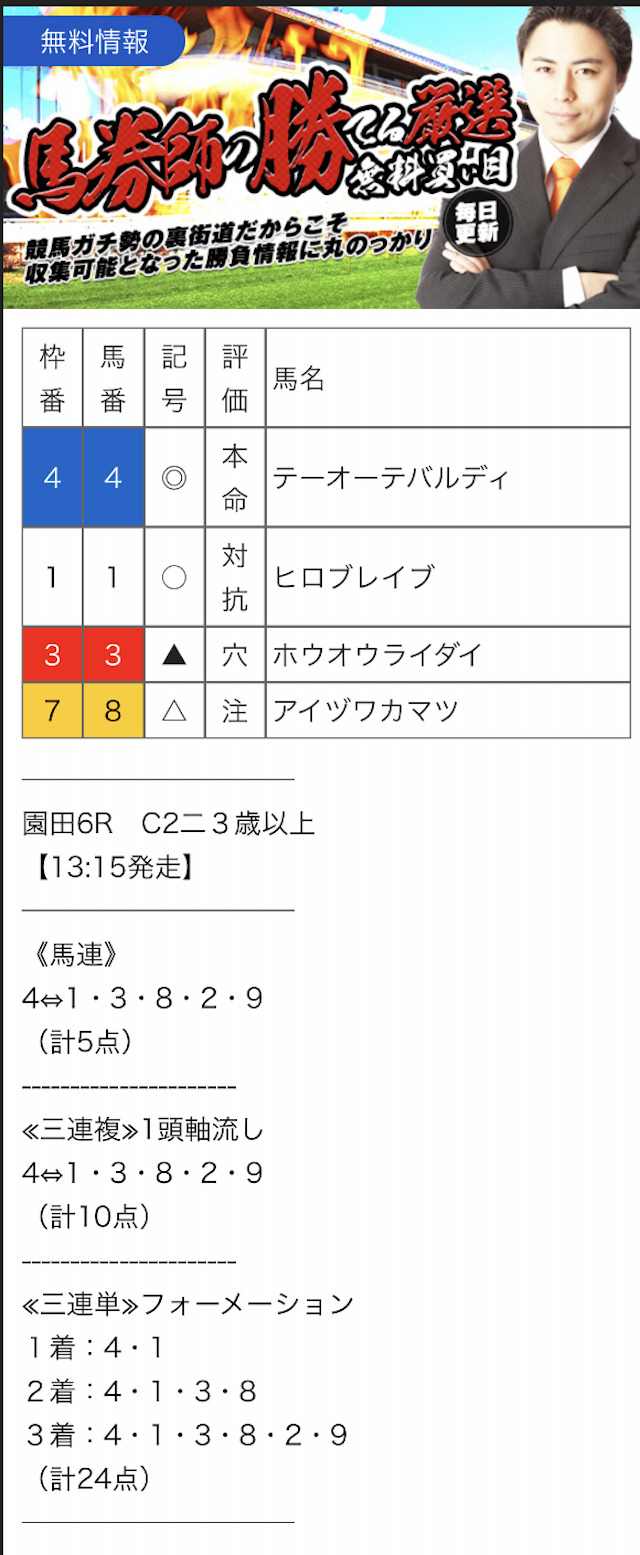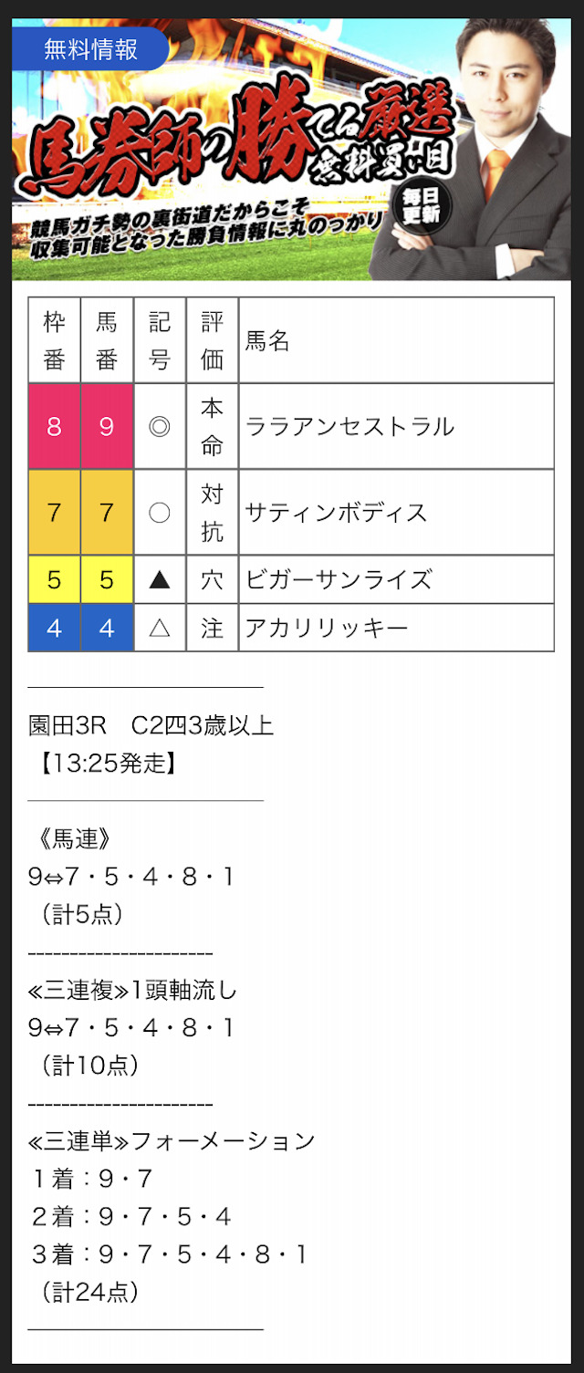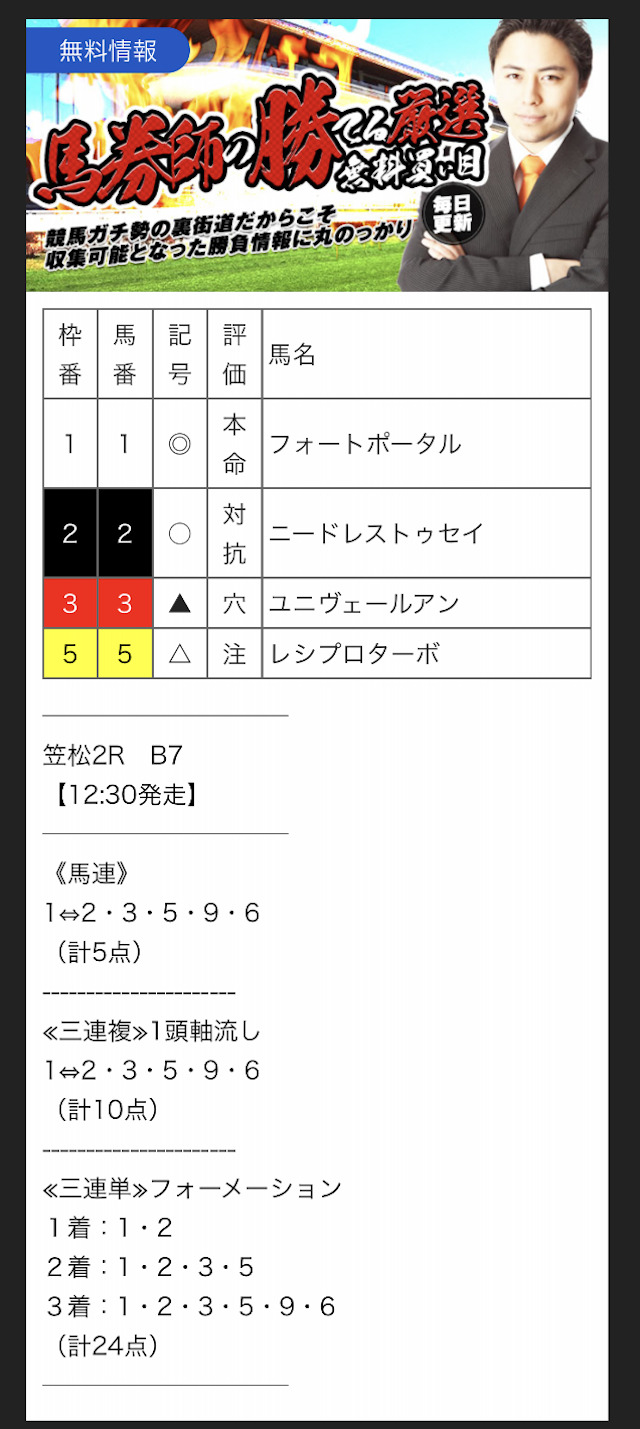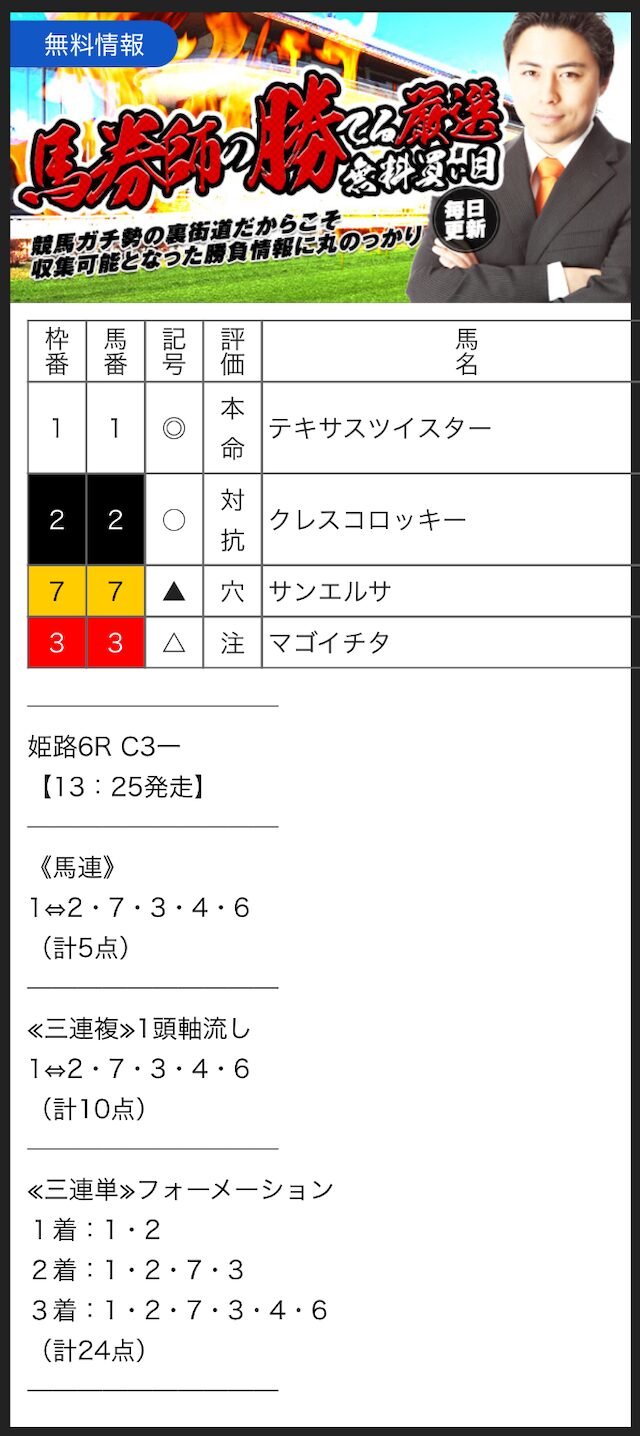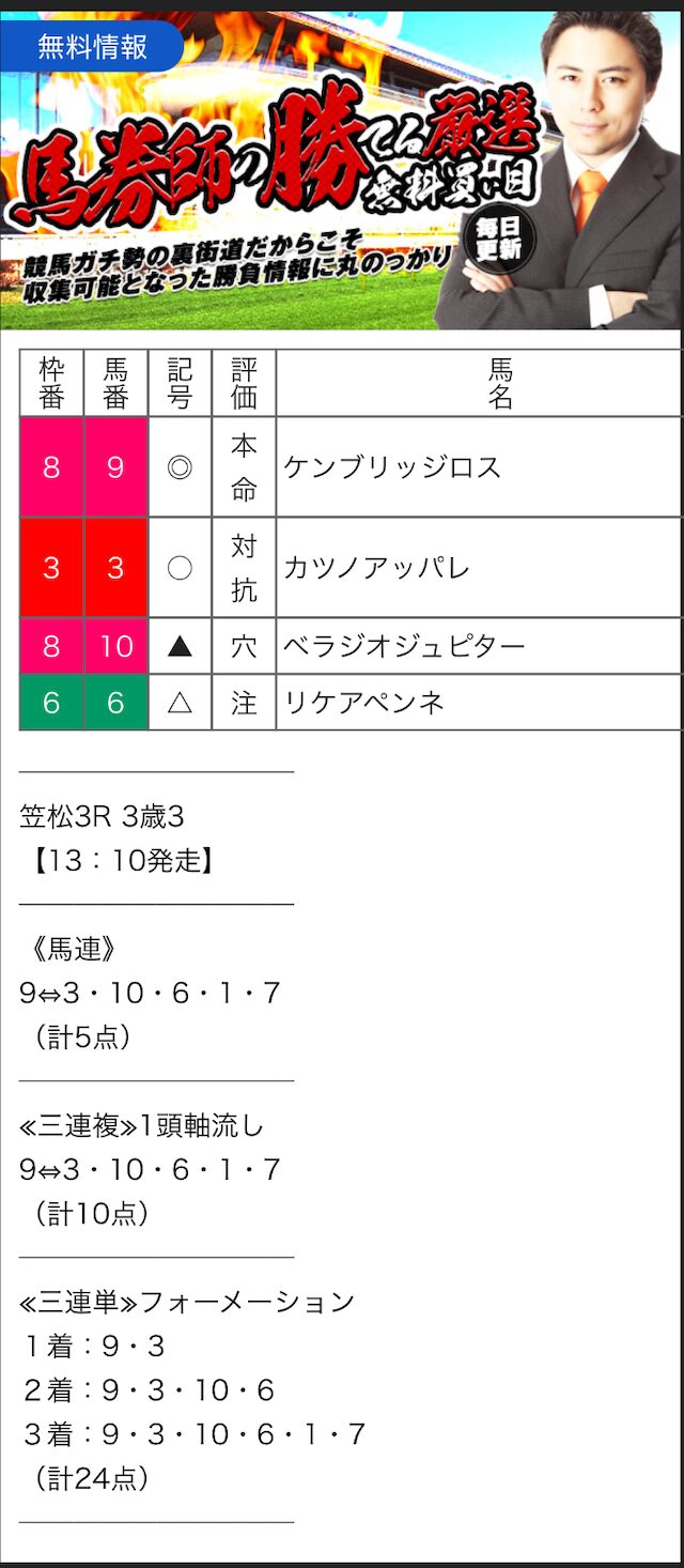 無料予想では、手堅く狙って当ててくれるので、競馬初心者の方にもオススメです。