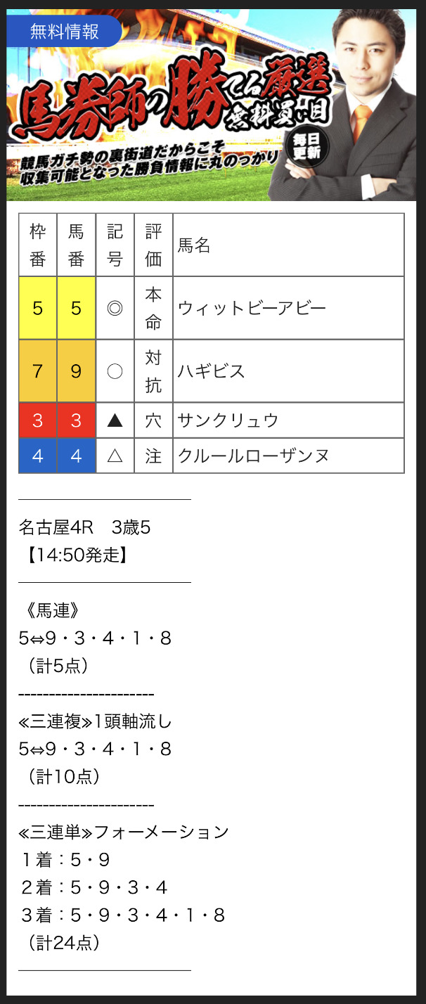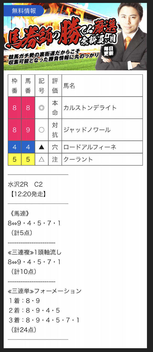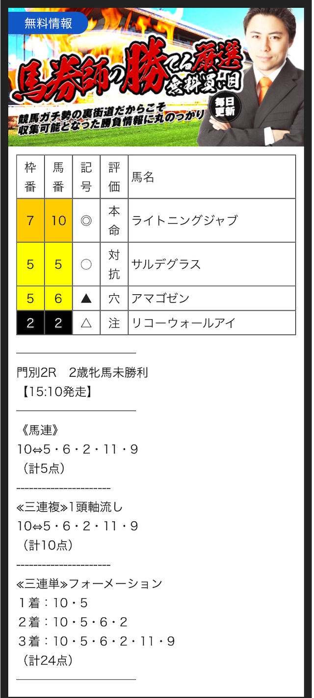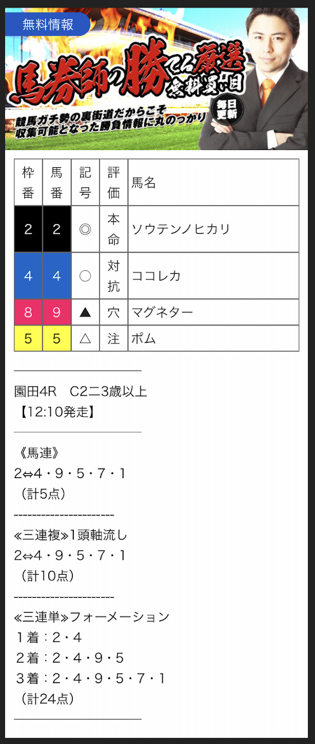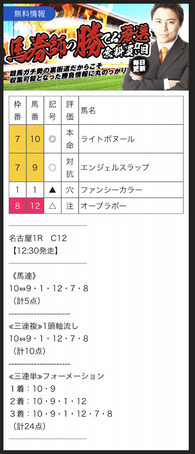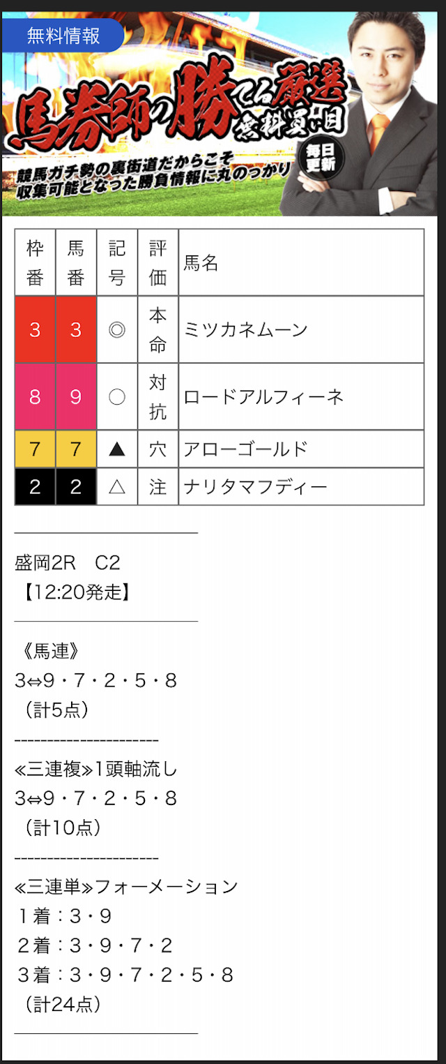 無料予想では、手堅く狙って当ててくれるので、競馬初心者の方にもオススメです。