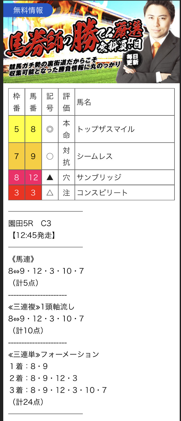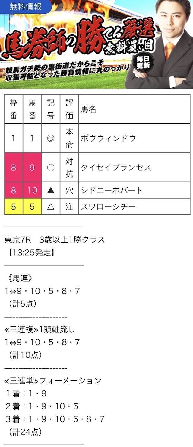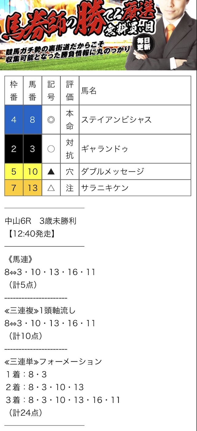 | 2023/9/24 中山10R:的中 | 📷特別支援戦争 | +1,996,980円 | 813% | 情報料金:260,000円 馬券代:19,800円 (合計279,800円) | 3連単:18点 |