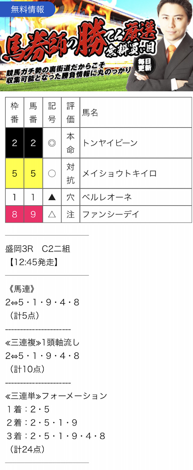 ★★★☆☆3.0 まぐろ 競馬歴:半年〜1年 30代女性 地方も中央も問わず、けっこう当たります。今のところ的中率は約70%。たま〜に外れることもありますが、しっかり利益が出ているので特に不満はありません。強いて言えば、予想の見せ方が少しごちゃごちゃしていて見づらいので、そこが改善されるとさらに使いやすくなると思います。競馬裏街道では、毎日しっかり稼げる環境が整っています。